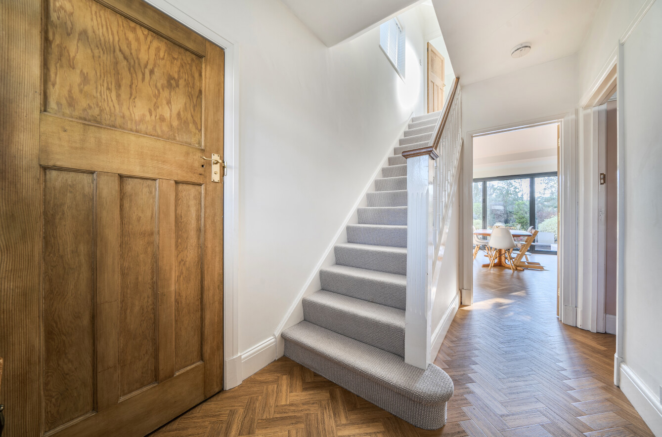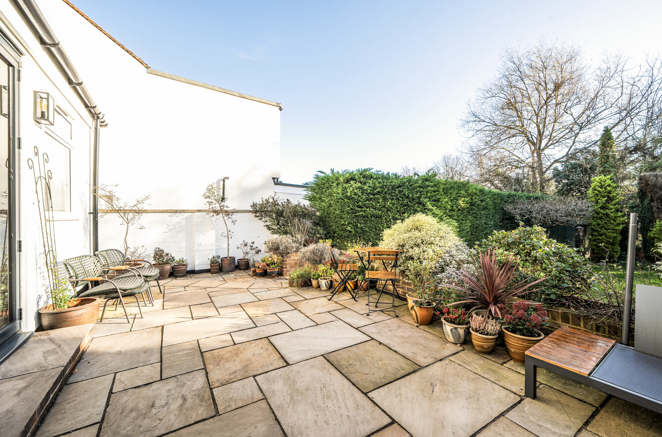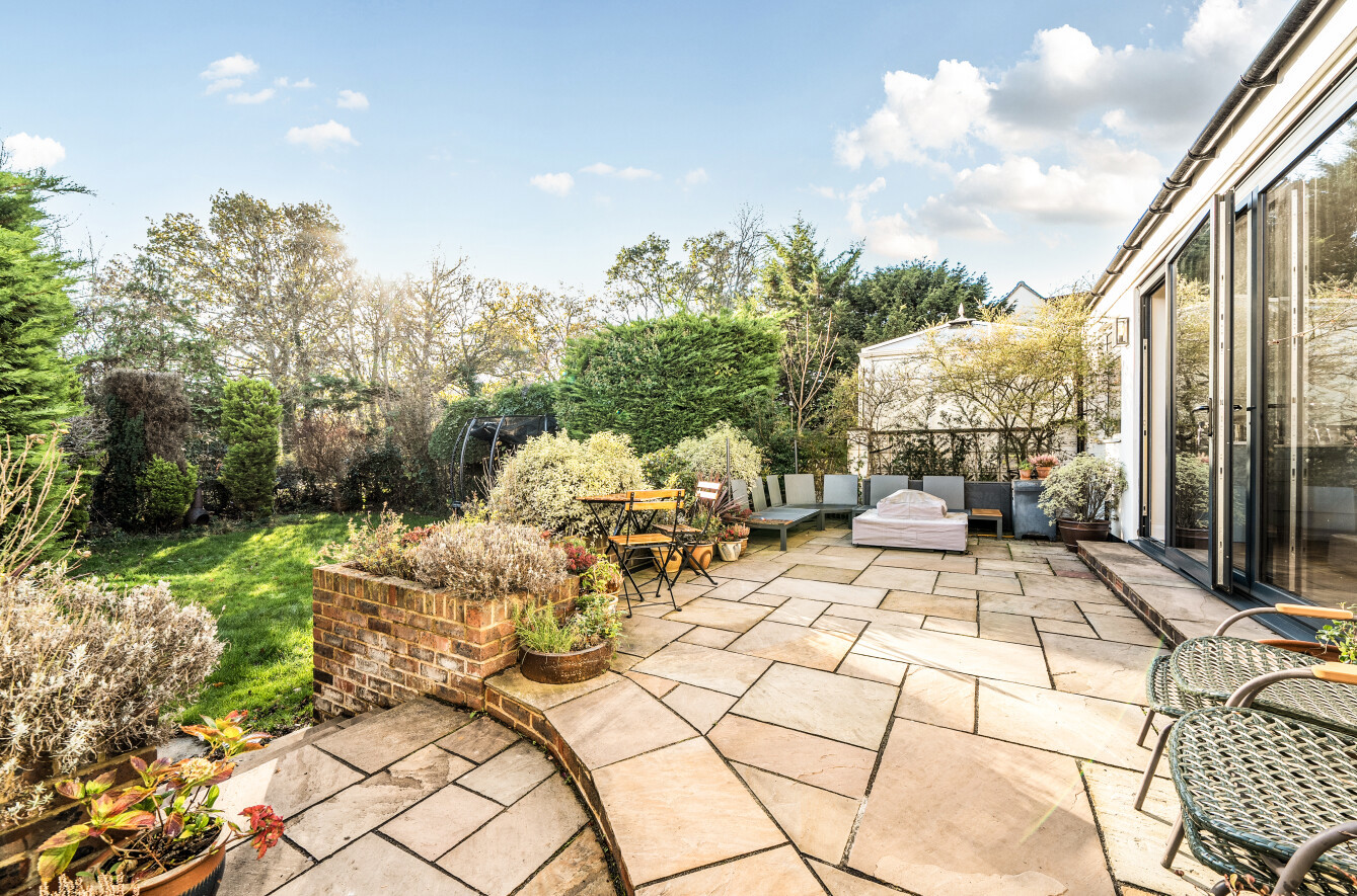 Externally, the landscaped, south facing rear garden is enclosed by well-maintained mature evergreen trees, providing year-long peaceful seclusion. It is mainly laid to lawn and offers a large patio area providing an idyllic setting for outdoor relaxation and al fresco dining.