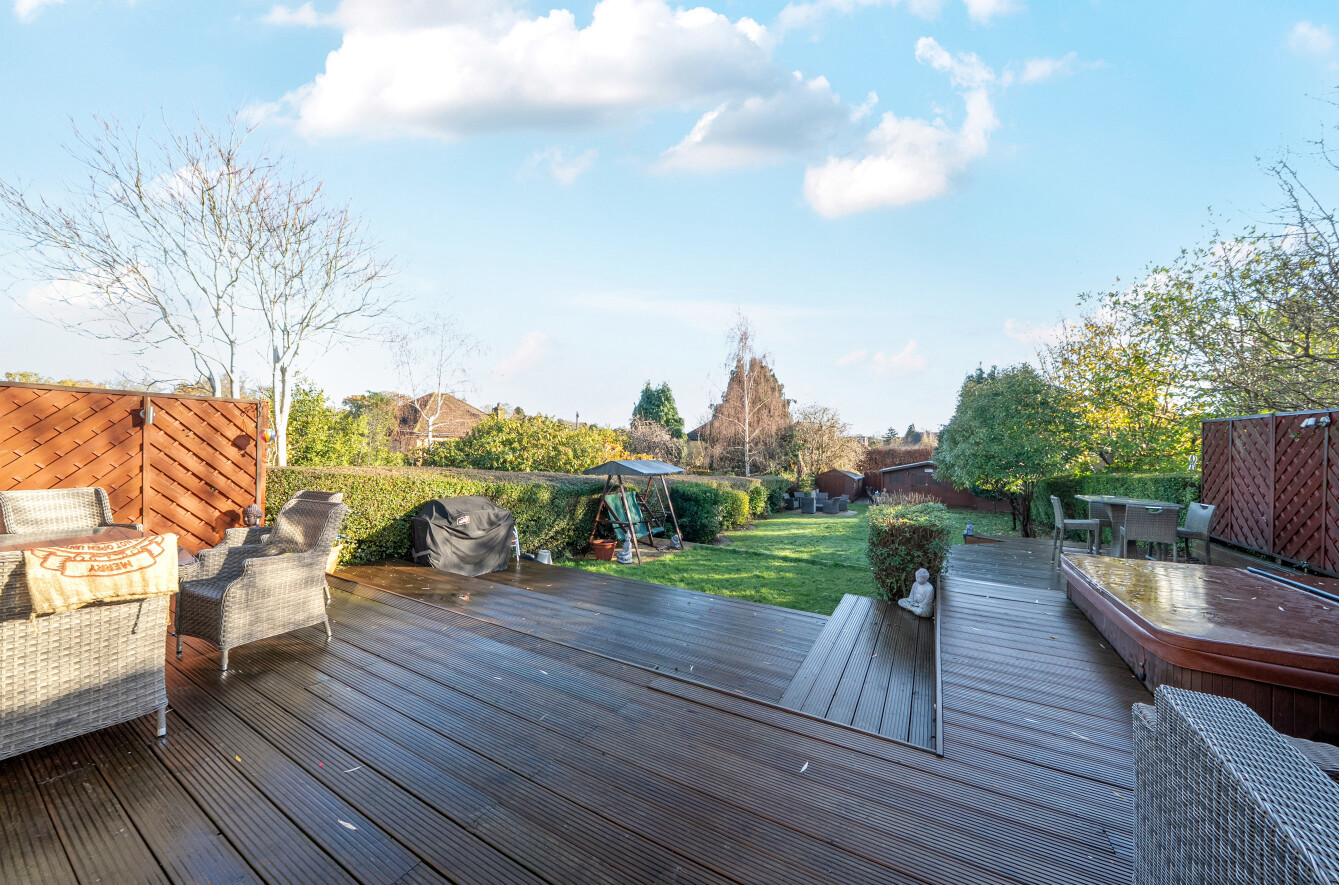 A particular highlight to this property is the rear garden, measuring in excess 120ft with a large, tiered, decked patio with a remote controlled awning and recessed hot tub, accommodating everything from large social gatherings to quiet relaxation. The garden's use extends into the evening with lighting across the tiered decked area.