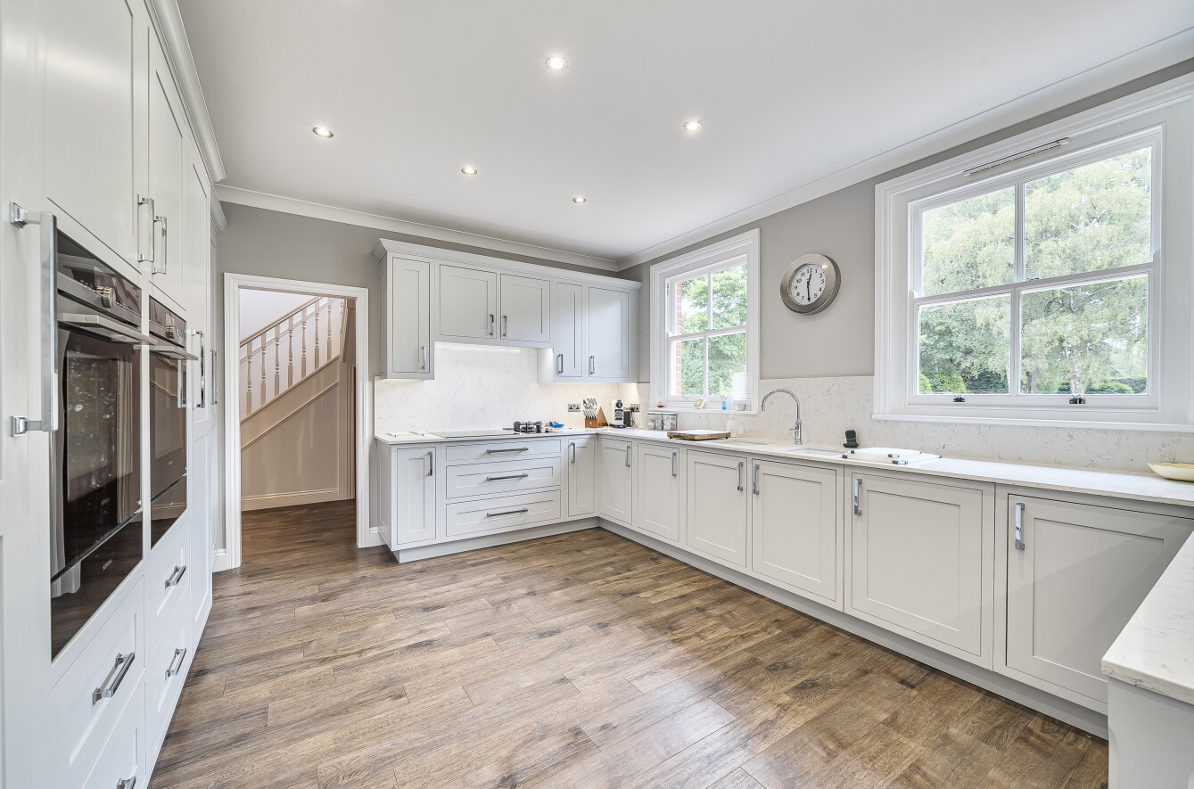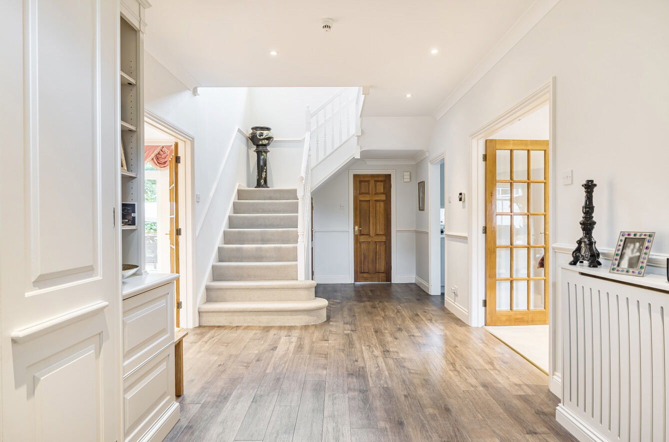 To the first floor are five double bedrooms, all with fitted wardrobes. The master suite comprises a generous dressing room and a modern four piece en-suite bathroom. Bedrooms two and three share a four piece jack& jill bathroom and bedroom four also benefits from a three piece en-suite shower room.