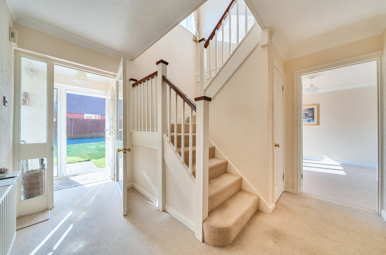 The front door opens into an enclosed porch, with a two piece downstairs cloakroom, and in-turn leads into a bright and spacious central entrance hall. There is a double aspect sitting room with patio doors leading out to the rear garden plus a separate dining room. The kitchen comprises a good range of fitted wall and units with space for appliances plus a separate utility room with matching units and convenient doors to the garden and garage.