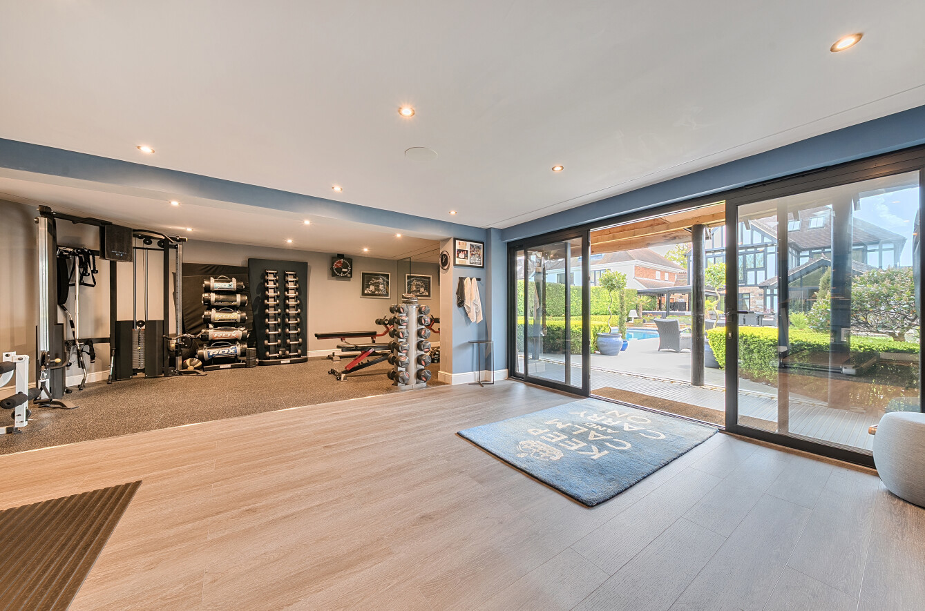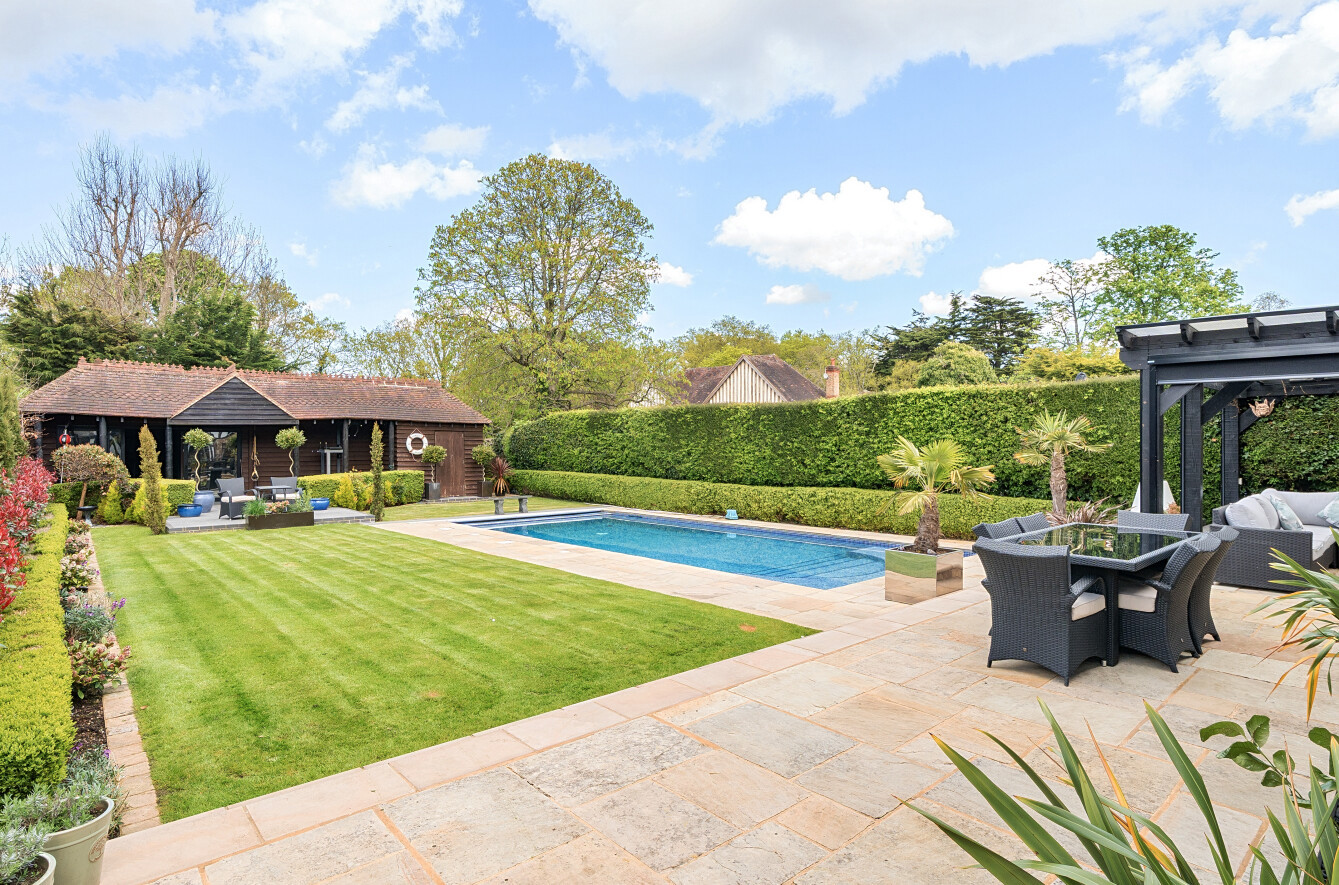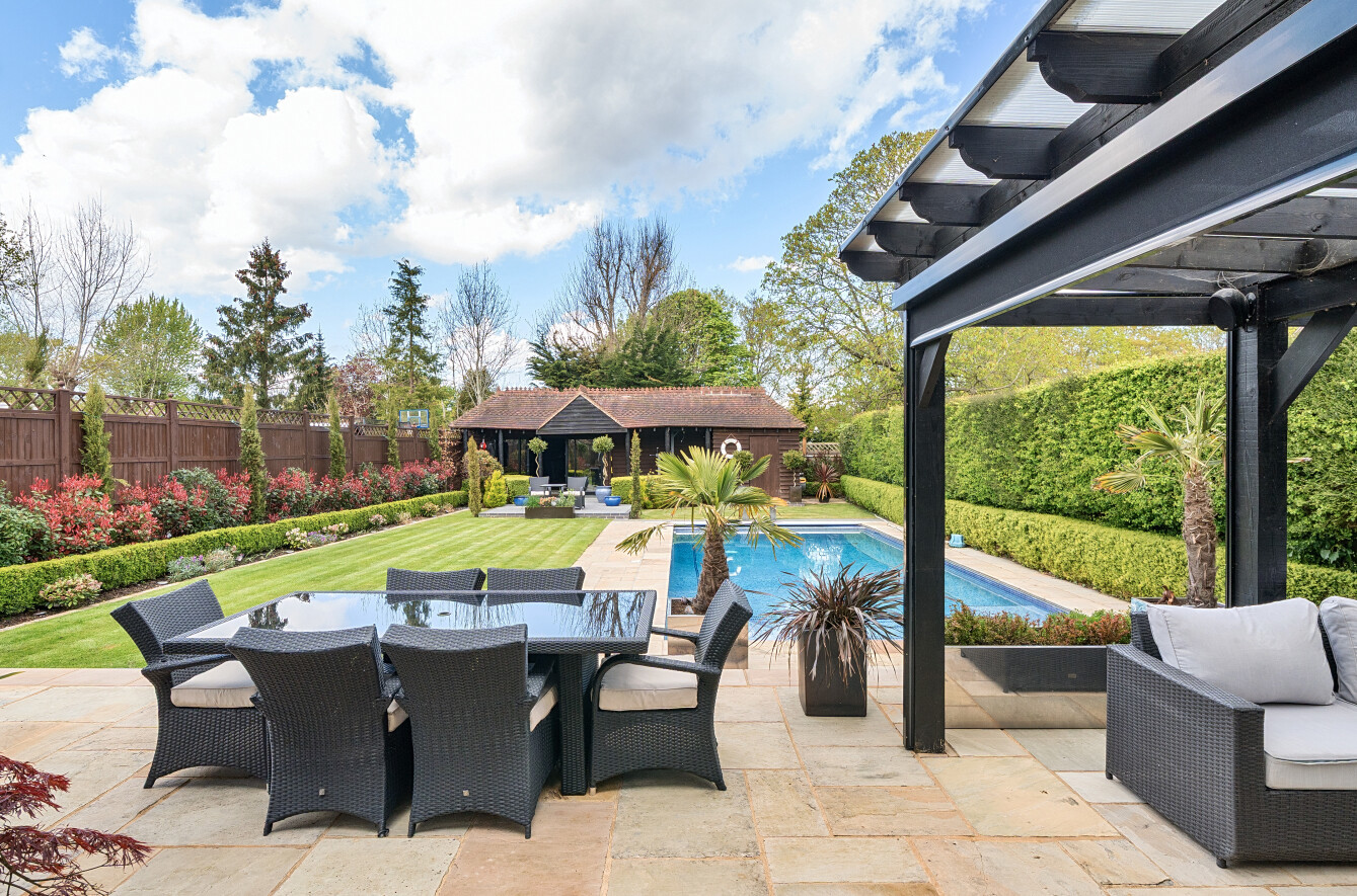 Outside, the rear garden has been thoughtfully landscaped for low maintenance, featuring tended lawns, two separate patio areas perfect for alfresco dining and entertaining. The swimming pool benefits from an electric cover and at the far end of the garden there is a large pavilion style outbuilding which is currently set up as a gym, but easily adaptable to suit the needs of the incoming purchaser.