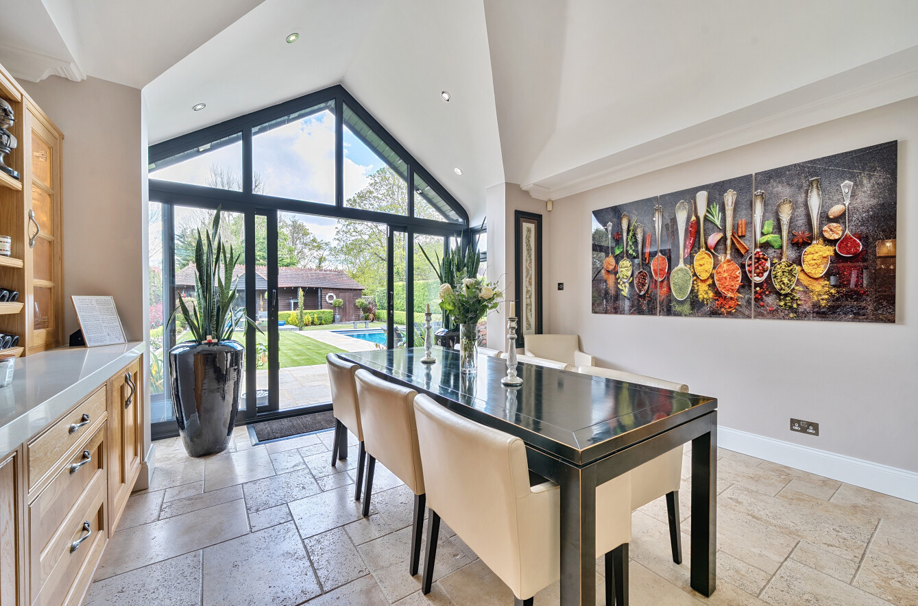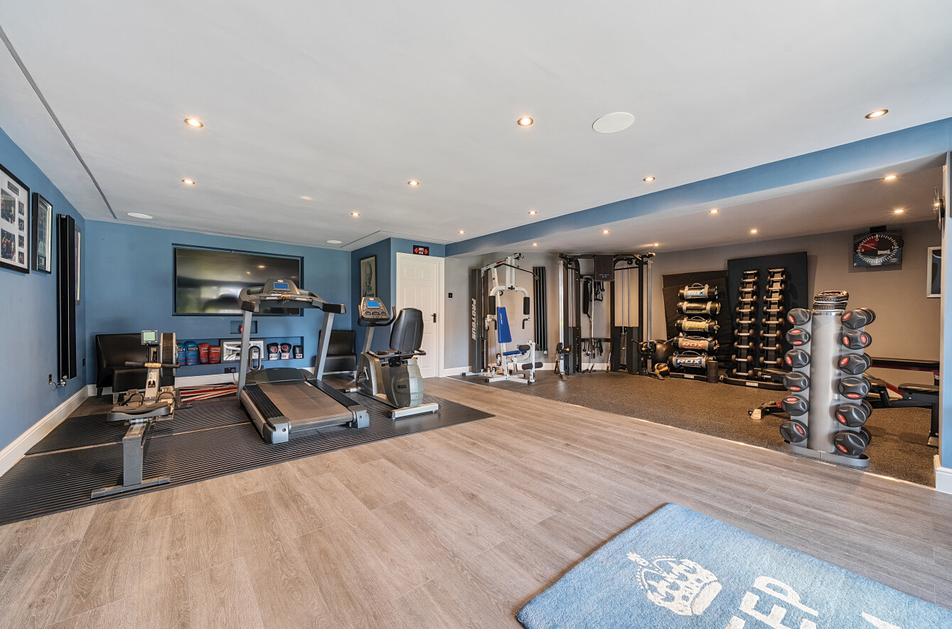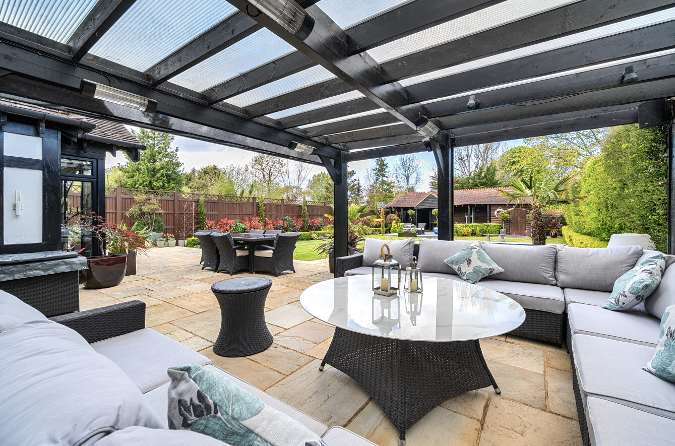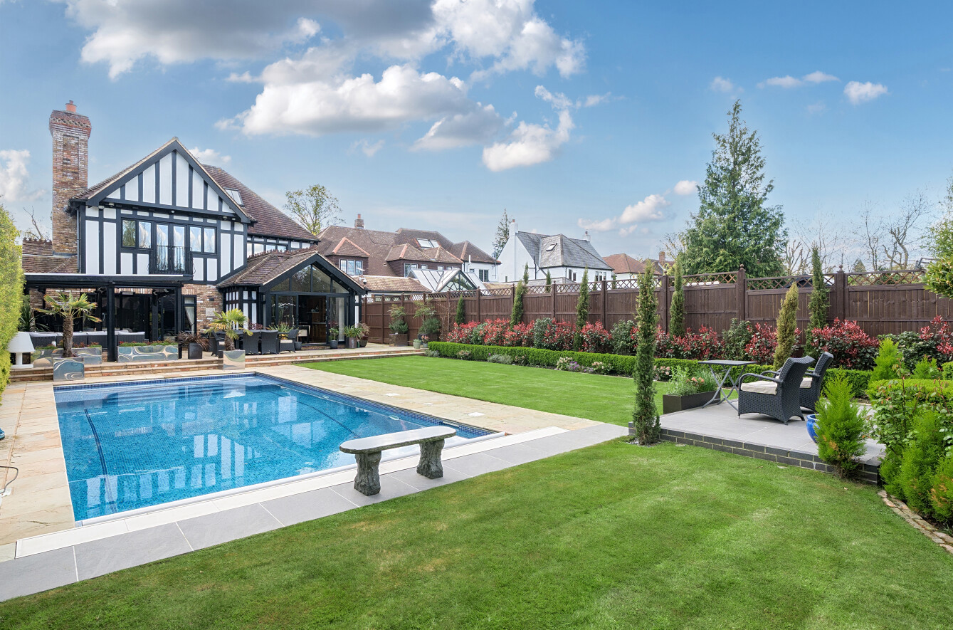 Outside, the rear garden has been thoughtfully landscaped for low maintenance, featuring tended lawns, two separate patio areas perfect for alfresco dining and entertaining. The swimming pool benefits from an electric cover and at the far end of the garden there is a large pavilion style outbuilding which is currently set up as a gym, but easily adaptable to suit the needs of the incoming purchaser.