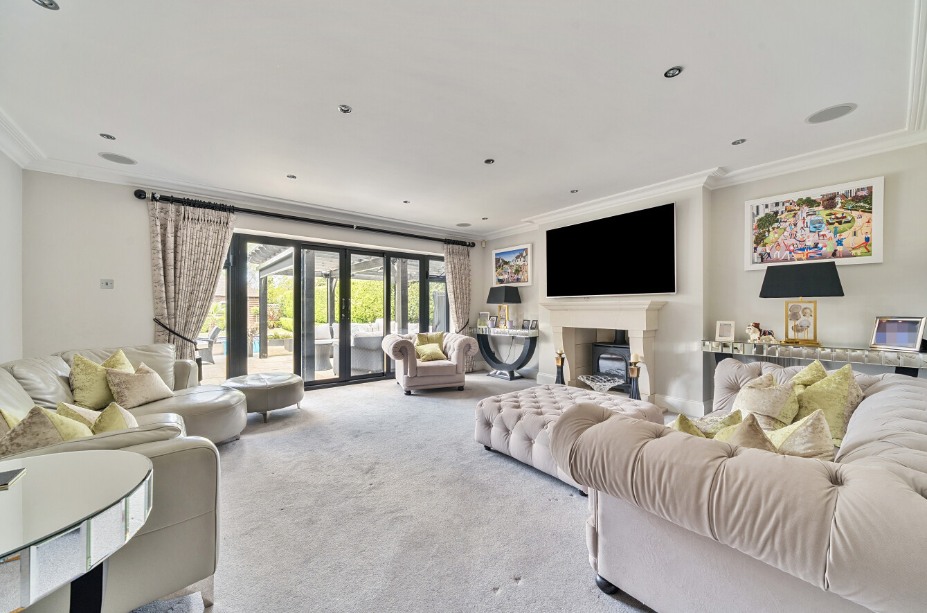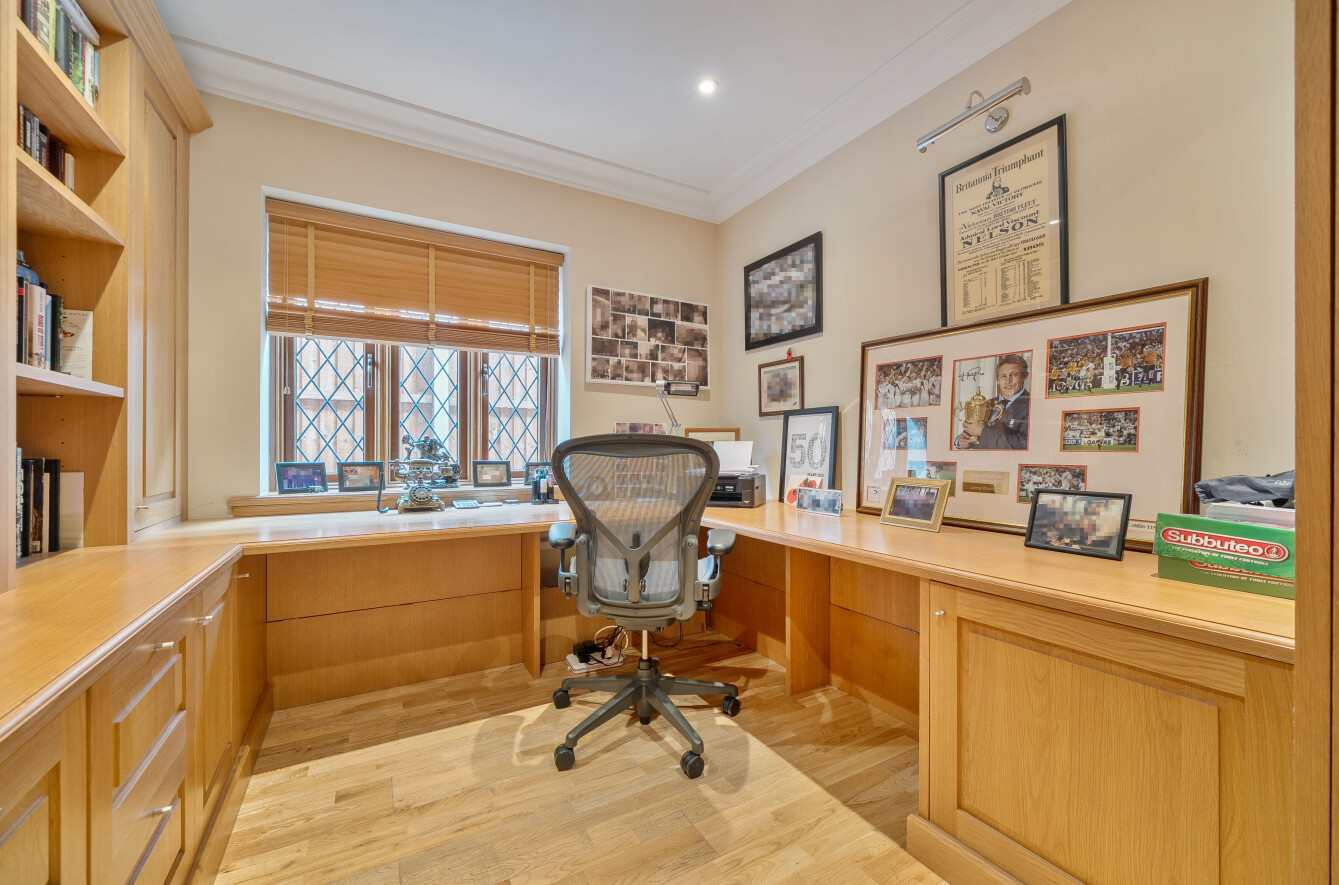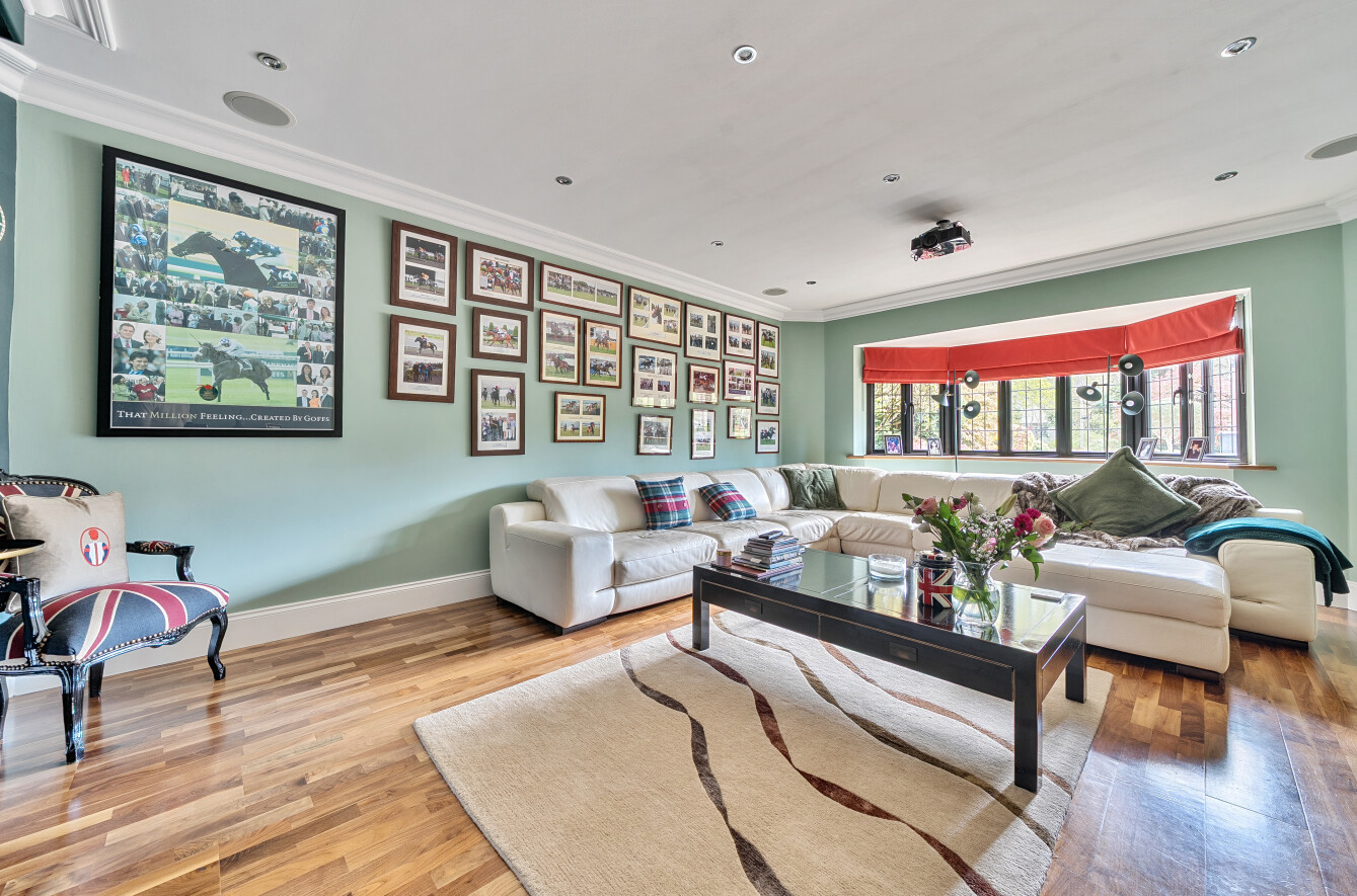 The spacious family room is currently used as a cinema room, and the formal living room features a central stone fireplace and has sliding doors that lead out on to the rear garden terrace. The dedicated office is fitted with Stoneham oak furniture and further provides multiple options for modern-day living. A downstairs cloakroom completes the ground floor.