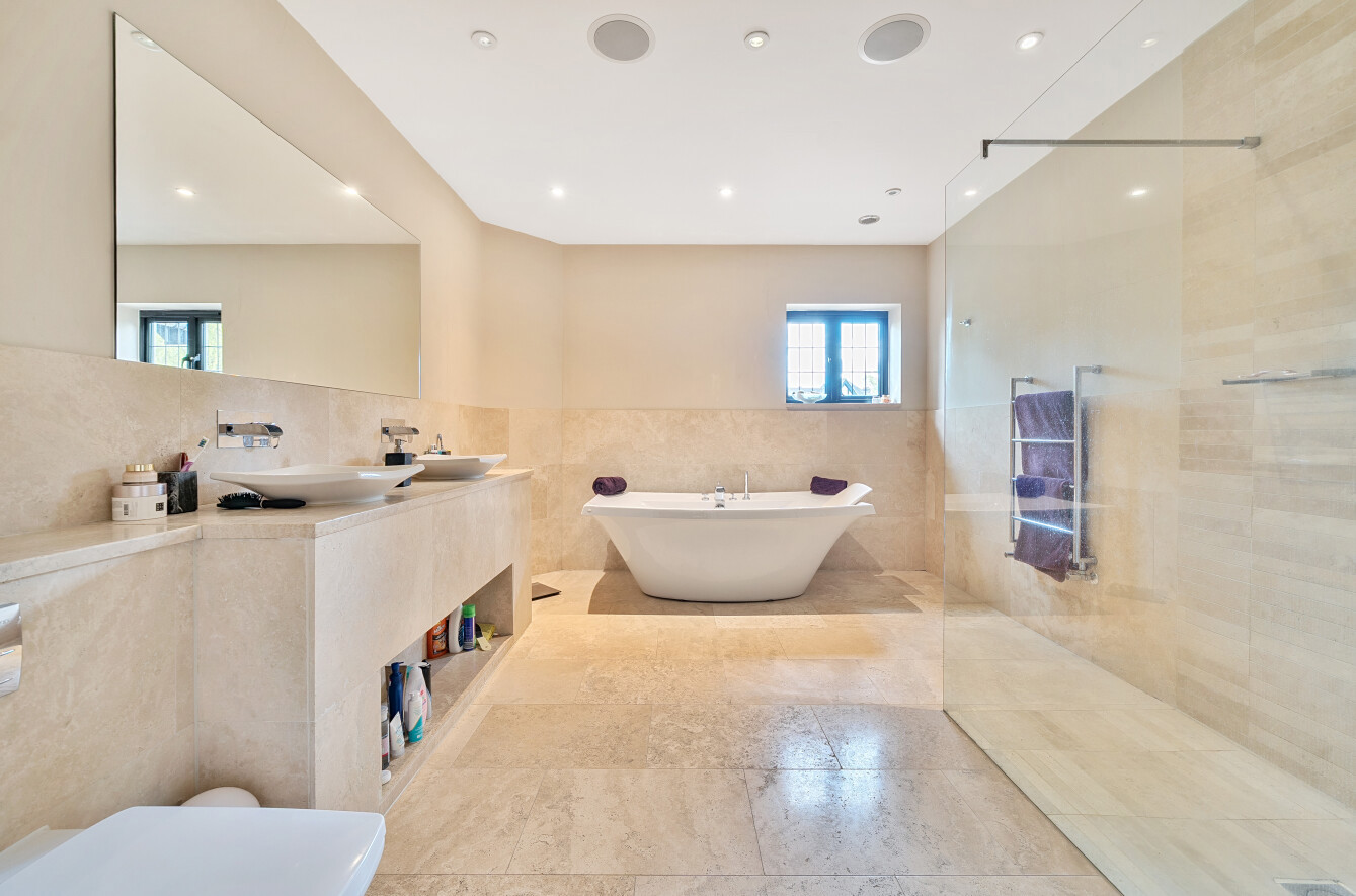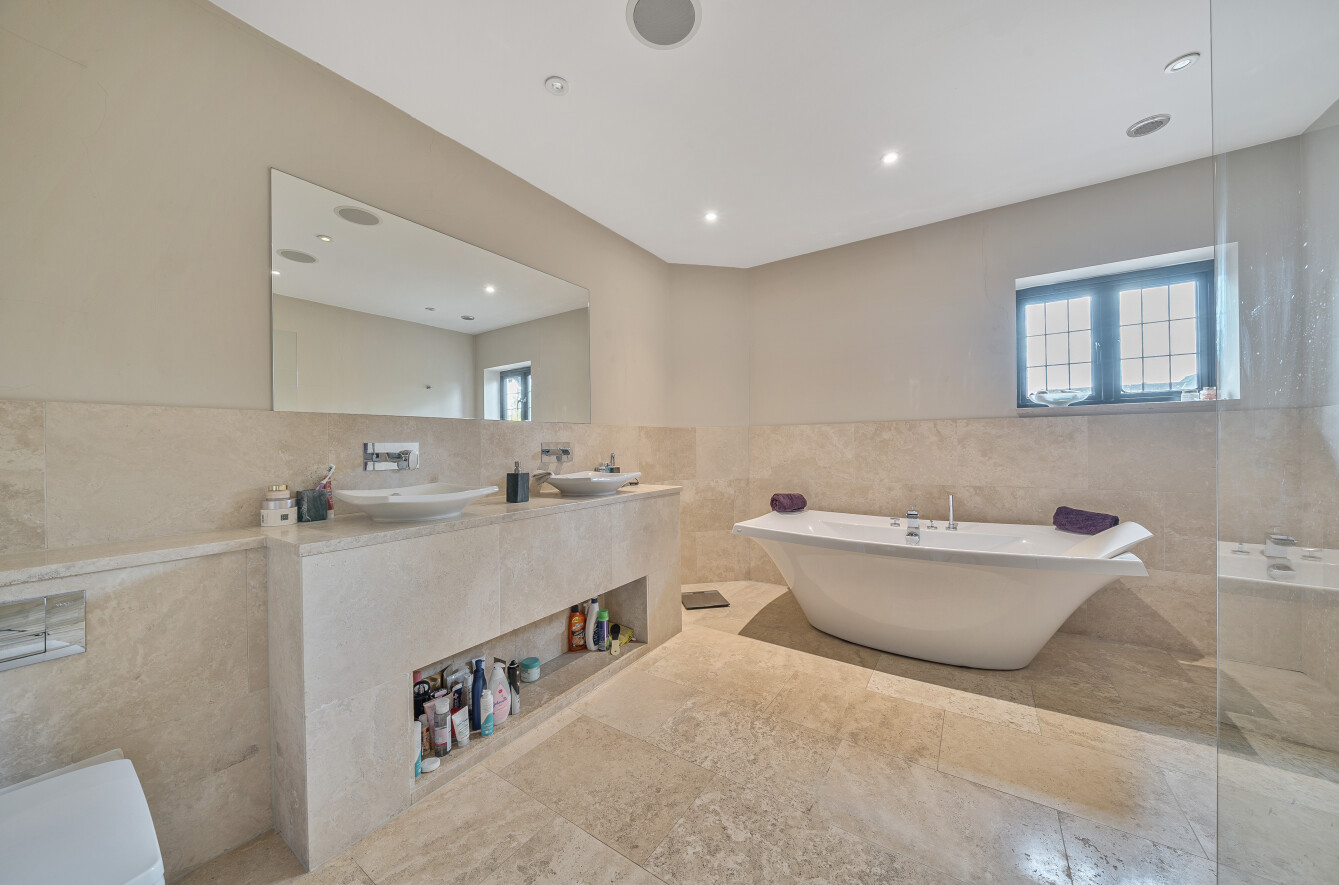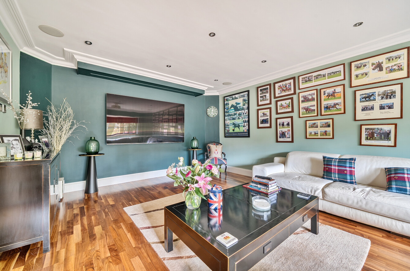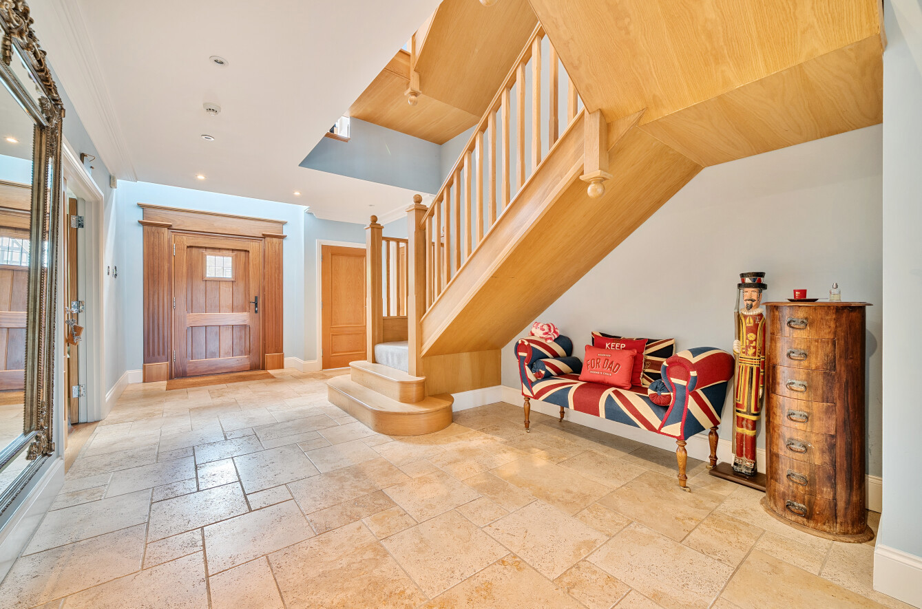 The spacious family room is currently used as a cinema room, and the formal living room features a central stone fireplace and has sliding doors that lead out on to the rear garden terrace. The dedicated office is fitted with Stoneham oak furniture and further provides multiple options for modern-day living. A downstairs cloakroom completes the ground floor.