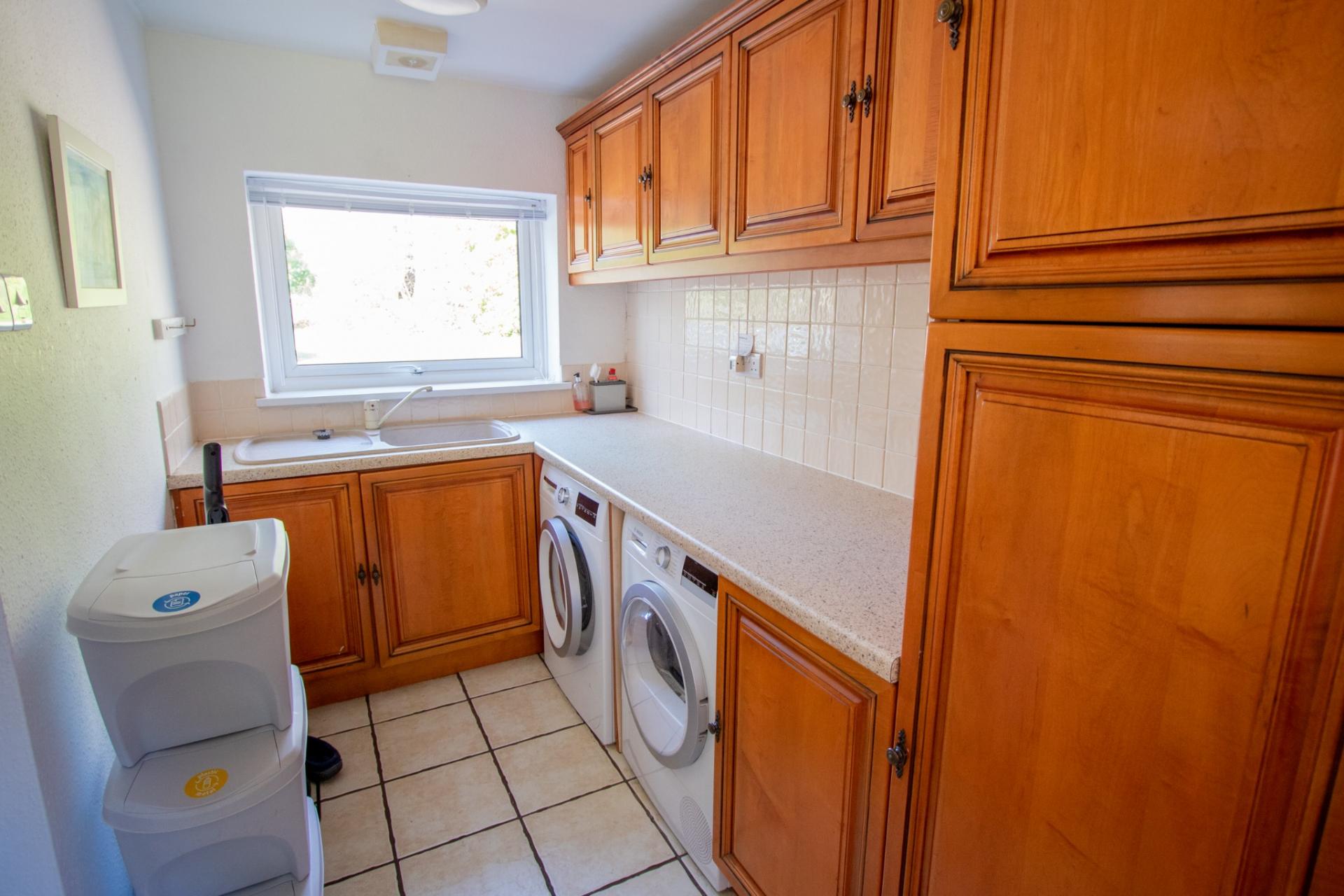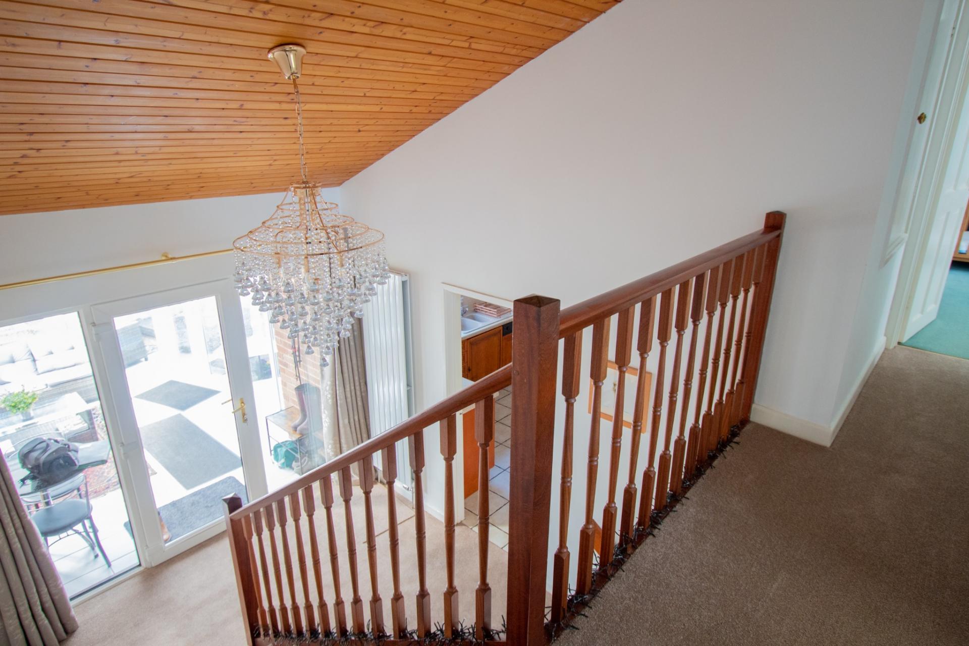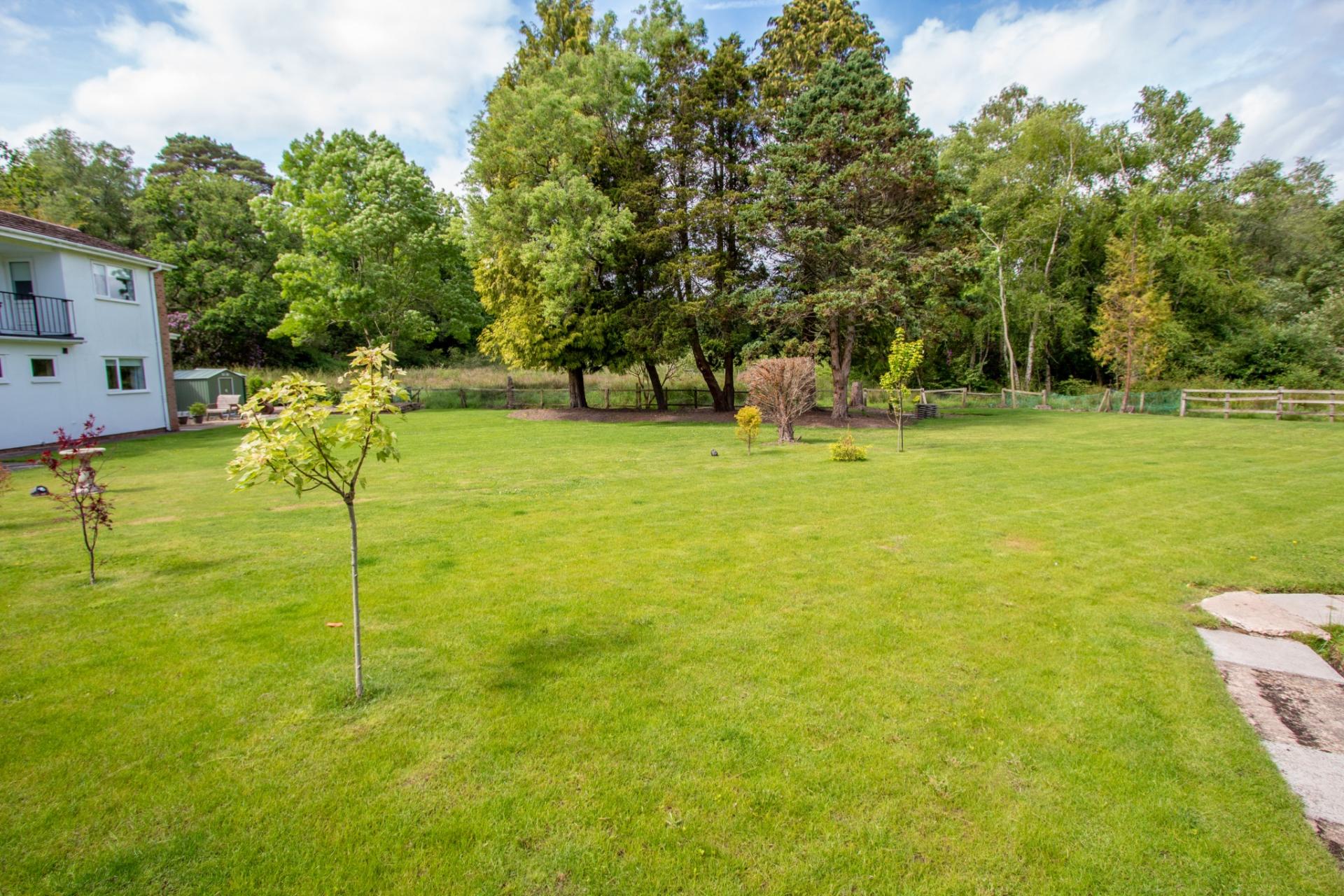 On the ground floor, there is a conservatory with tiled flooring and door into the entrance hallway with vaulted wooden panelled ceiling, 4 steps down to the lower ground floor and stairs up to the first floor with door leading to the kitchen/breakfast room, fitted with a range of wall and base units, worktop surfaces, built in double oven, hob with extractor hood over, integrated dishwasher, walk in larder (with small wine cellar below), breakfast bar, door leading into the utility room with further units and oil filed boiler (newly fitted 2025). From the hallway there is a door into the dining room, with a vaulted wooden-panelled ceiling. There are 4 steps down from this room to the sitting room and a door into the study/bedroom 4, which is a lovely triple aspect room with patio doors to the outside. On the lower ground floor, there is a hallway with doors to the master bedroom, with built-in wardrobes and an en-suite shower room, separate cloakroom and a lovely light dual-aspect living room offering an attractive outlook over the garden. On the first floor, there is access to loft storage and two further bedrooms (one with airing cupboard), both with built-in wardrobes and both with access to the balcony, which is a lovely place to sit and enjoy the outlook.