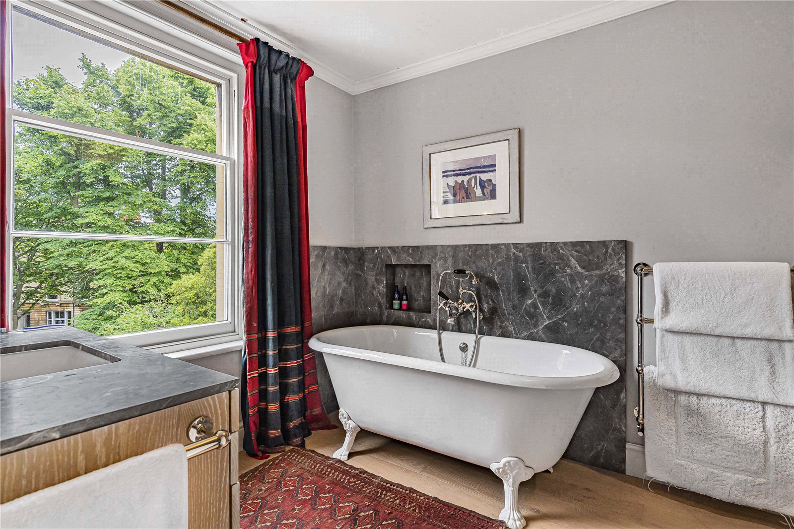 On the second floor, the master bedroom benefits from a large dressing room and bathroom with Lefroy Brooks ceramics including rolltop standalone bath and separate shower. There are two further bedrooms on the third floor both featuring original Georgian shutters and are serviced by a family bathroom and study with ample built-in storage.