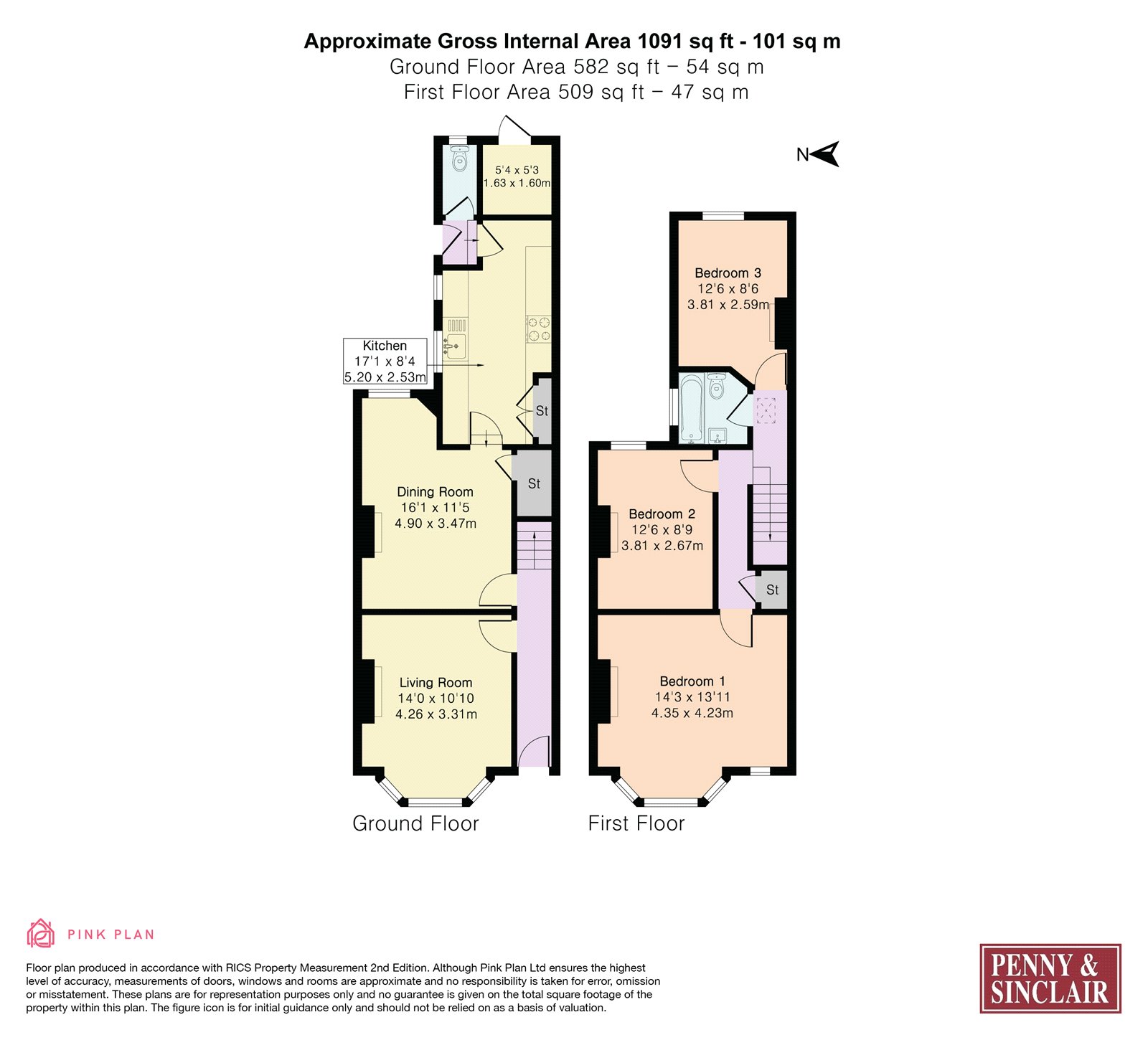 On the first floor, the property offers three well-proportioned bedrooms, including a spacious principal bedroom to the front and two further double bedrooms overlooking the rear garden. A family bathroom completes this level.