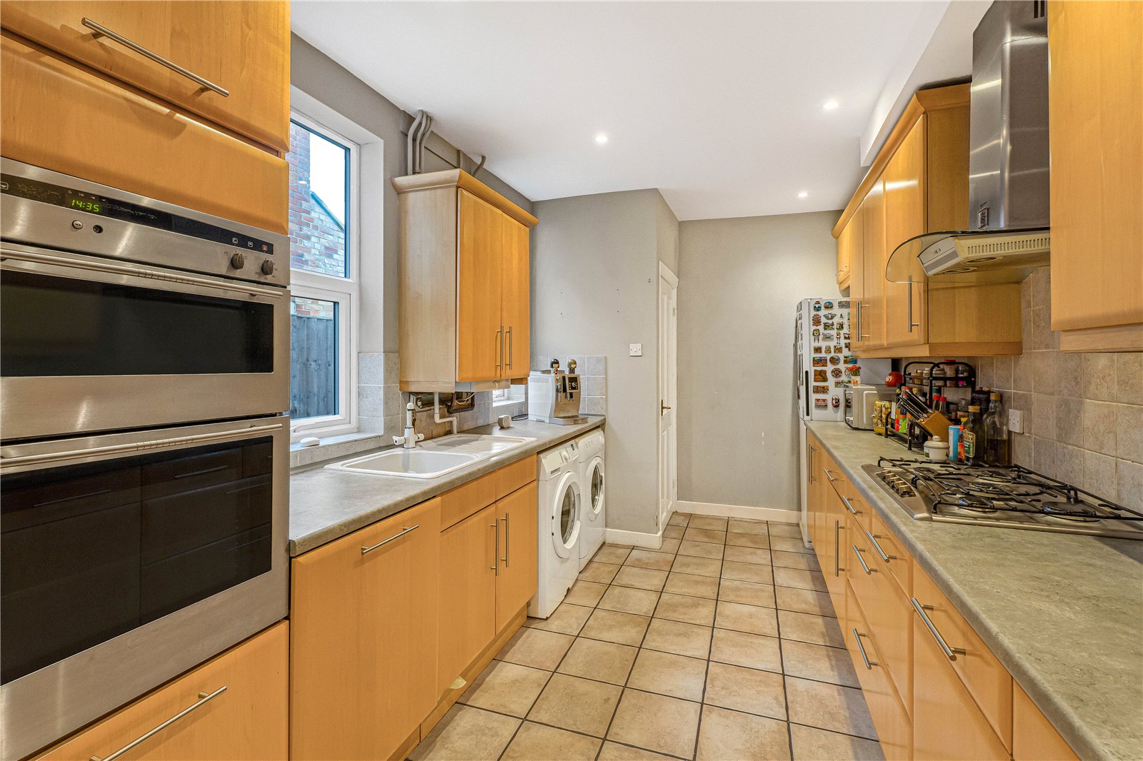 The kitchen is located at the back of the property and offers a practical layout while overlooking the rear garden. From here there is direct access to the garden.