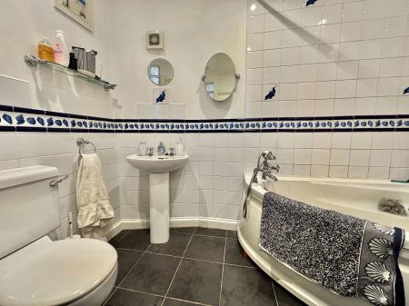 EN-SUITE BATHROOM Comprising a three piece suite including a low level WC, pedestal wash hand basin, and corner bath with shower attachment over. The room is finished with tiled walls and an extractor fan.