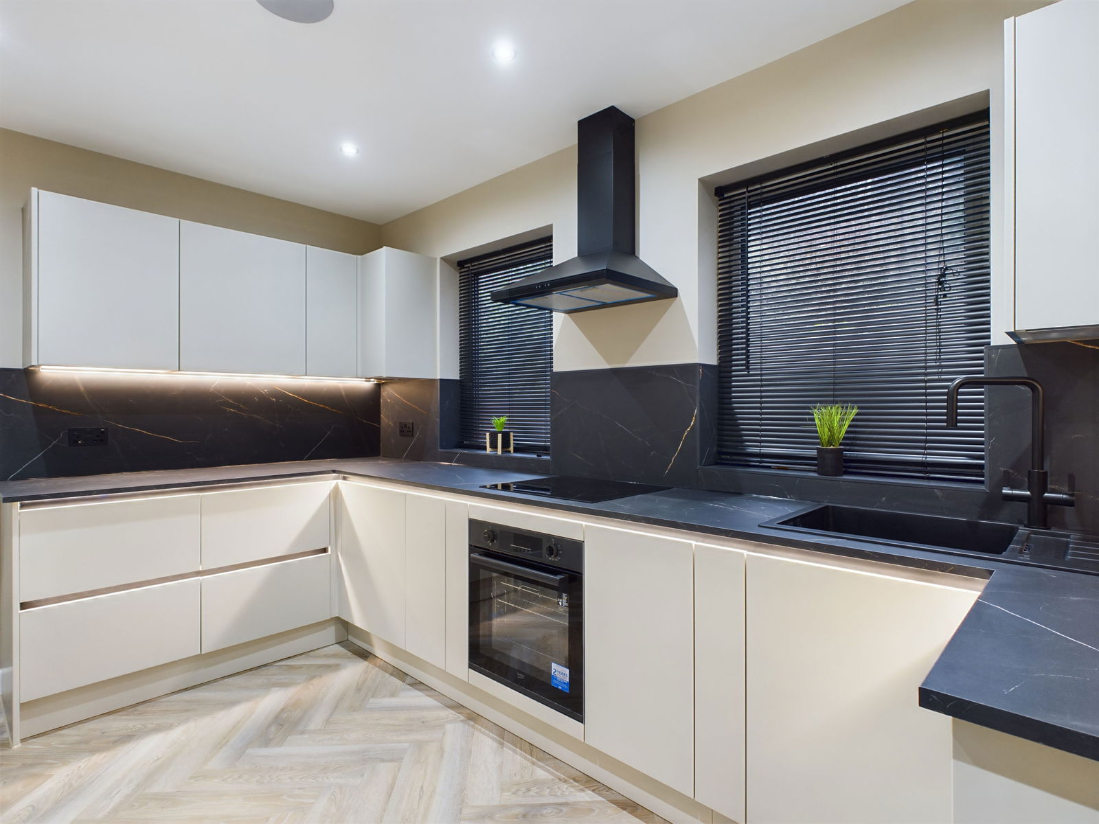 KITCHEN A brand new and luxurious kitchen boasting a range of overhead, base and drawer units with square edged work surfaces above and following up the wall as a splash back. A 1 bowl composite sink and drainer unit, an electric single oven with grill integrated and a four ring induction hob with extractor hood above. An integrated washing machine, space and plumbing for a fridge freezer, a deep fitted pantry cupboard, two uPVC double glazed windows and a gas central heated radiator.