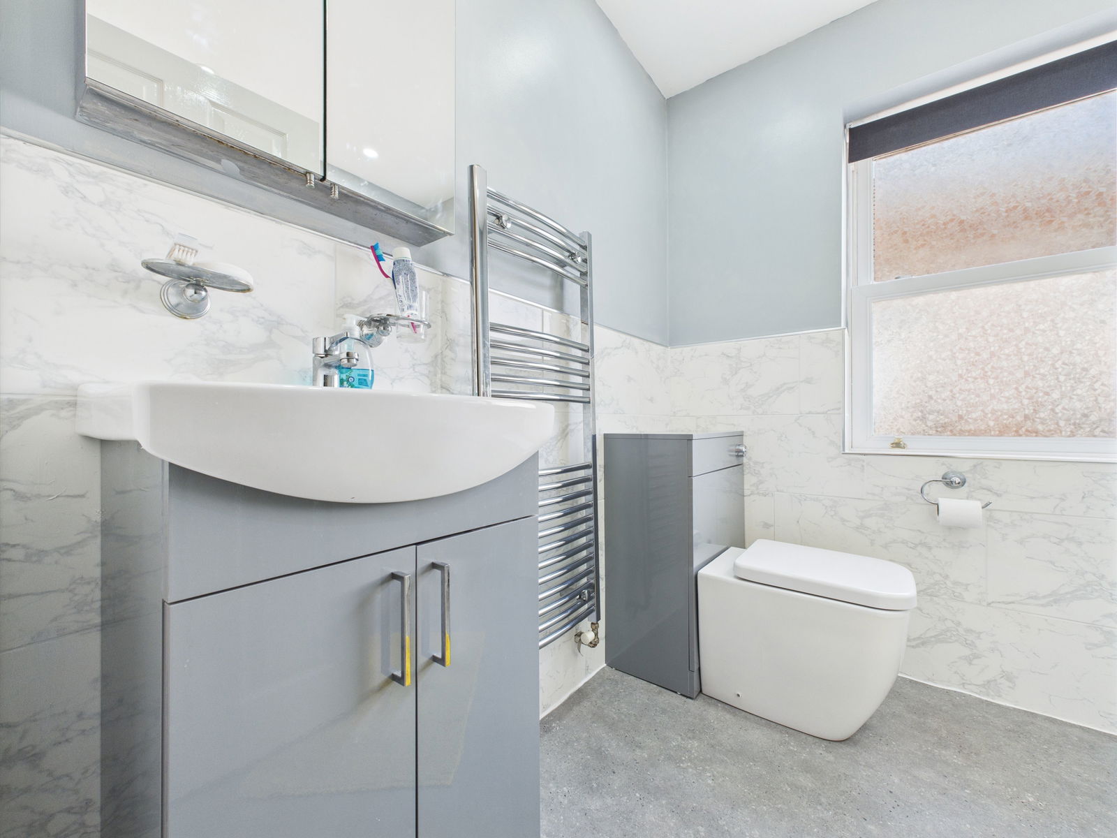 A stylish and well appointed modern shower room complete with a low level flush WC, a vanity unit with wash basin and integrated storage and a walk in corner shower. Finished with tasteful tiled walls, an extractor fan, uPVC obscure double glazed sash windows and a contemporary chrome heated towel rail.