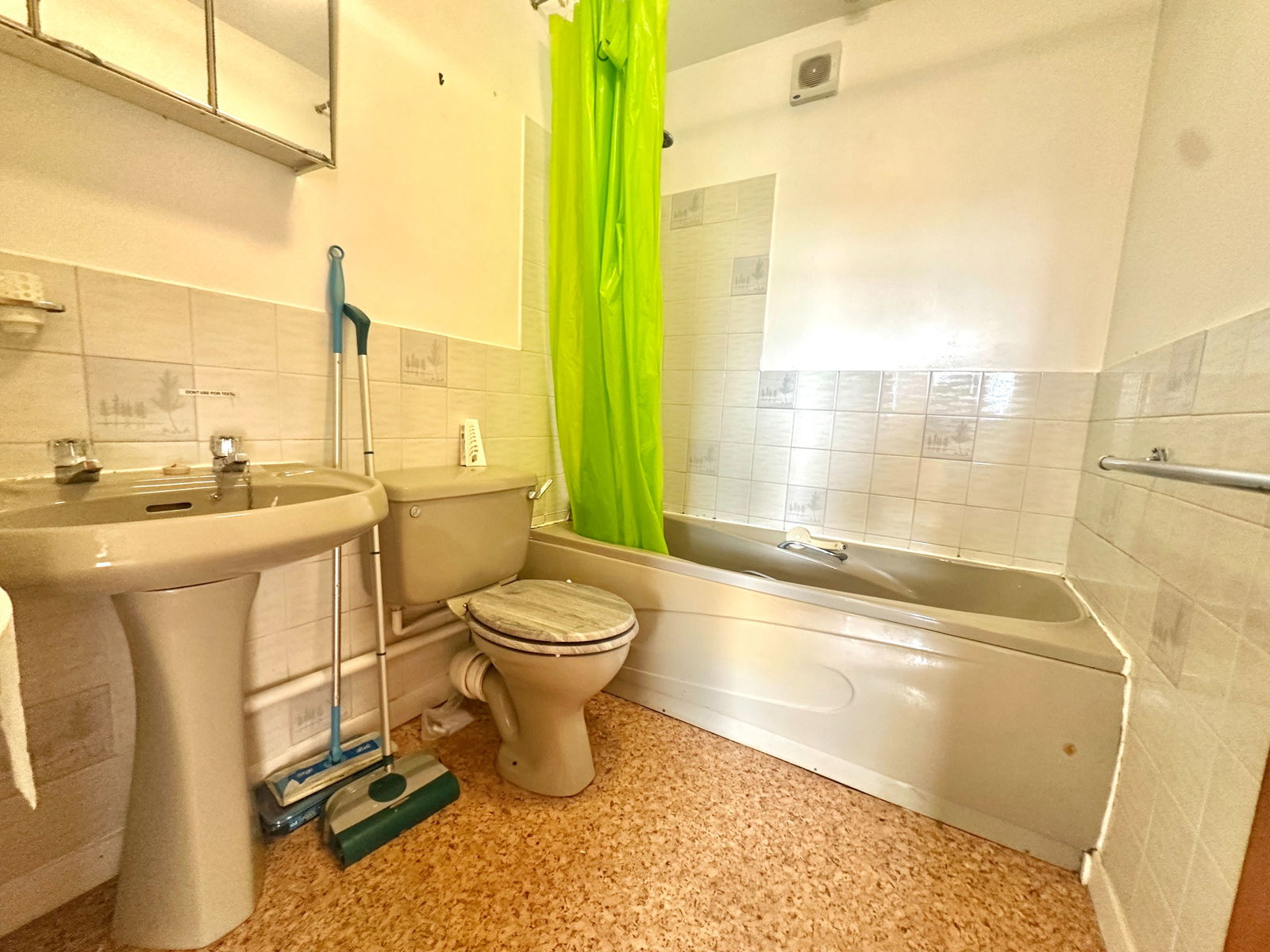 BATHROOM A three piece suite comprising of a low level flush WC, a vanity wash hand basin and a panelled bath unit with shower attachments above. Extractor fan and tiled walls.