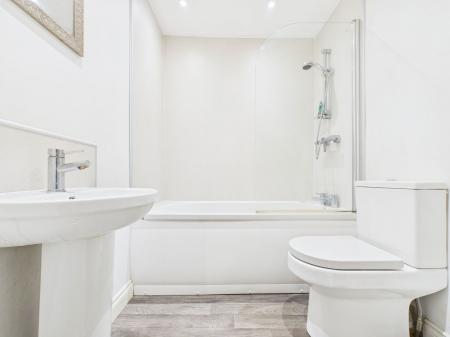 BATHROOM Modern white suit comprising panelled bath, pedestal wash basin and low level WC. Splashbacks.