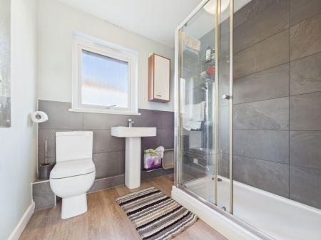 SHOWER ROOM A contemporary shower room comprising of a low level WC, pedestal wash hand basin, and a walk-in double shower, complemented by modern tiling and a uPVC obscure double-glazed window.