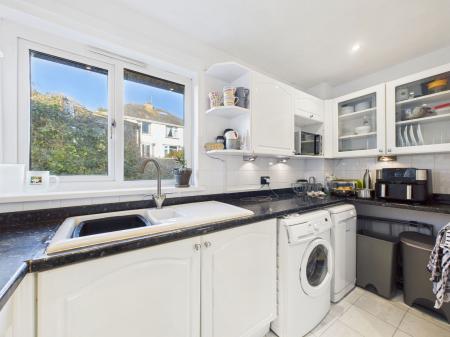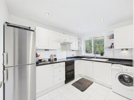 KITCHEN A spacious kitchen fitted with a comprehensive range of wall, base and drawer units topped with roll edged work surfaces. Features include a 1 1/2 bowl ceramic sink with drainer, an electric cooker with extractor hood above, and space with plumbing for a washing machine, fridge freezer and slimline dishwasher. Finished with a tiled splashback and a uPVC double glazed window.