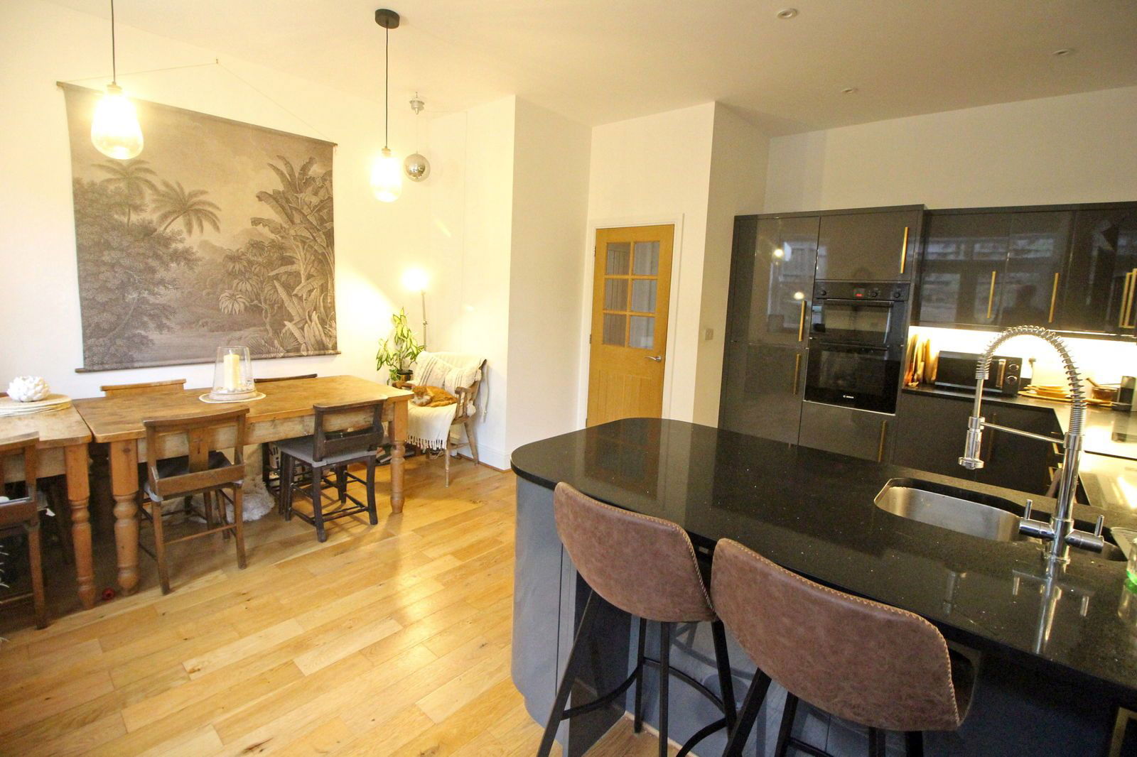 KITCHEN/DINER An incredibly large kitchen/diner perfect for modern day living and entertaining. The kitchen boasts a range of overhead, base and drawer units with quartz work surfaces above. A 1 1/2 bowl sink unit with drainer engraved into the quartz, an eye level electric double oven with grill integrated and an induction hob with extractor hood above. Further integrated appliances include fridge freezer, dishwasher and space for a washing machine . Breakfast bar for more casual seating as well as space for a 6/8 seater dining table also, double glazed sash window and further double glazed French doors opening out to the sunny rear courtyard garden.