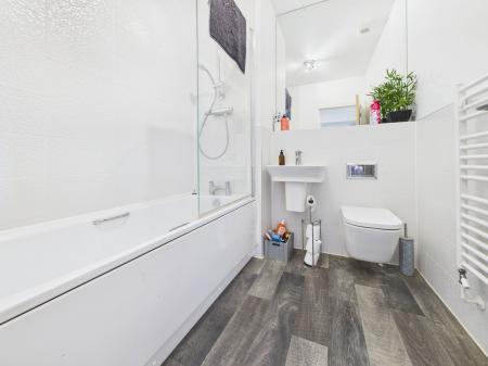 FAMILY BATHROOM A stylish family bathroom fitted with a panelled bath and overhead shower with glass screen, vanity wash hand basin and low level WC. Finished with tiled walls, extractor fan, shaver point and a heated towel rail.