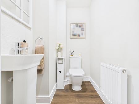 DOWNSTAIRS CLOAKROOM A useful downstairs cloakroom featuring a low level flush WC, pedestal wash basin, extractor fan and gas central heated radiator.