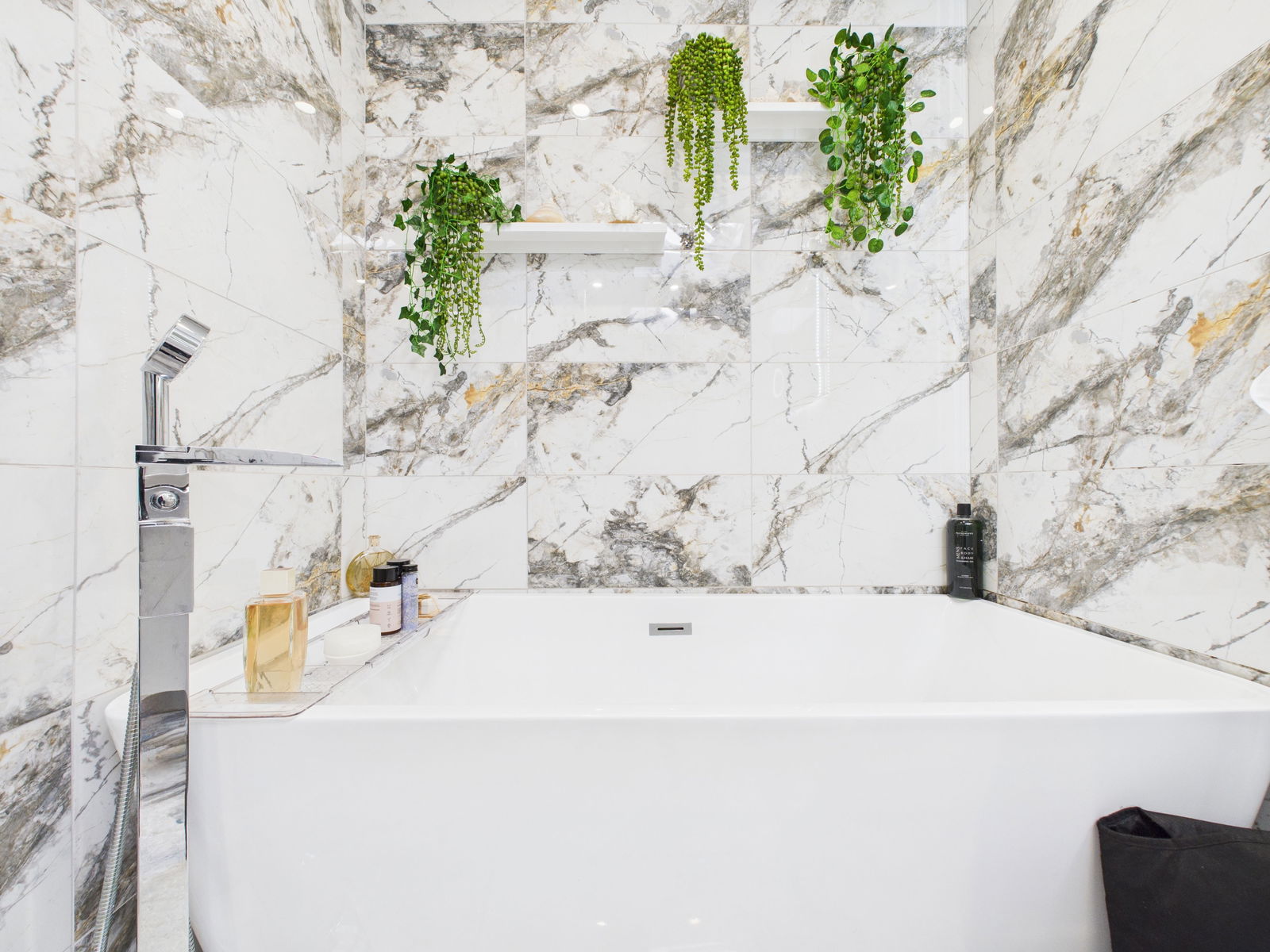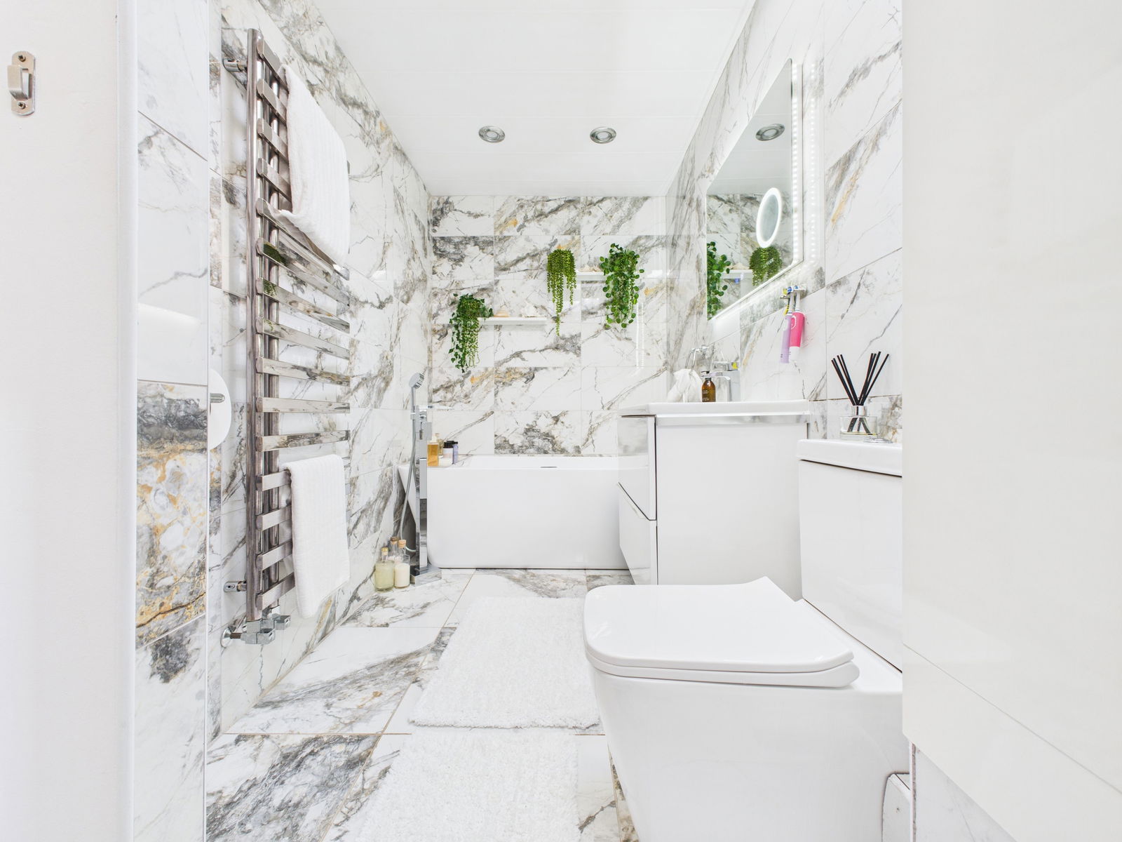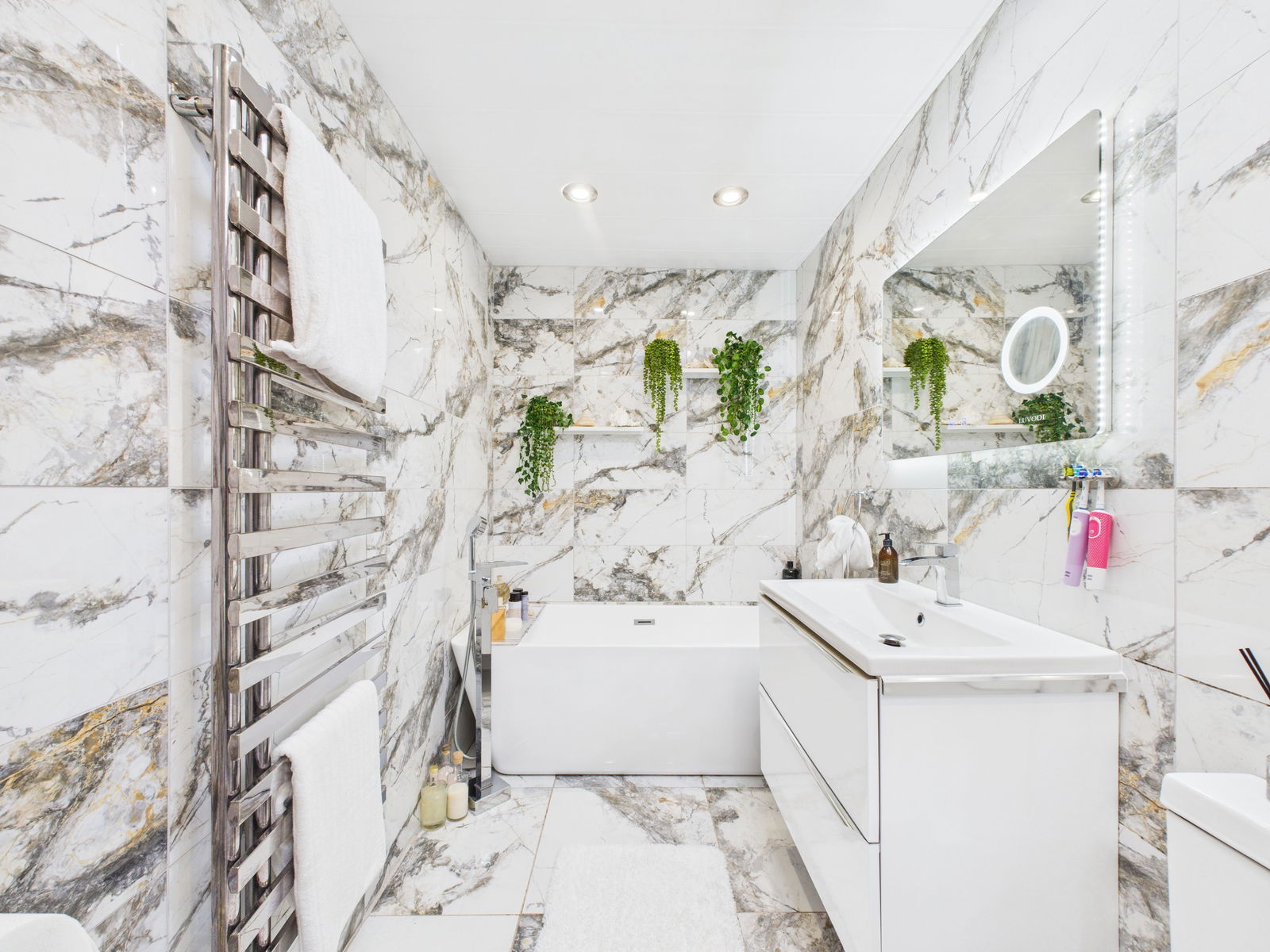 BATHROOM Stunning four piece luxury suite with tub style bath and freestanding chrome taps. Vanity counter basin, low level WC and chrome heated towel rail. Separate large shower cubicle with mains shower. Double glazing and ceiling windows.