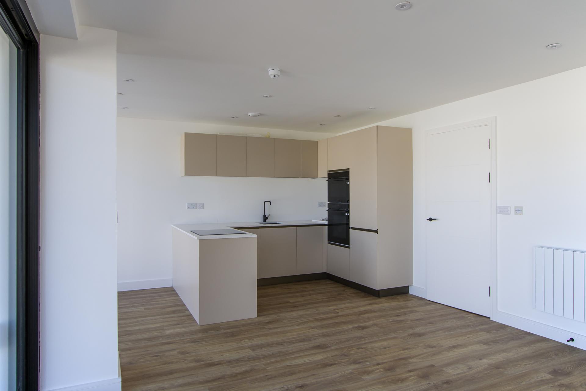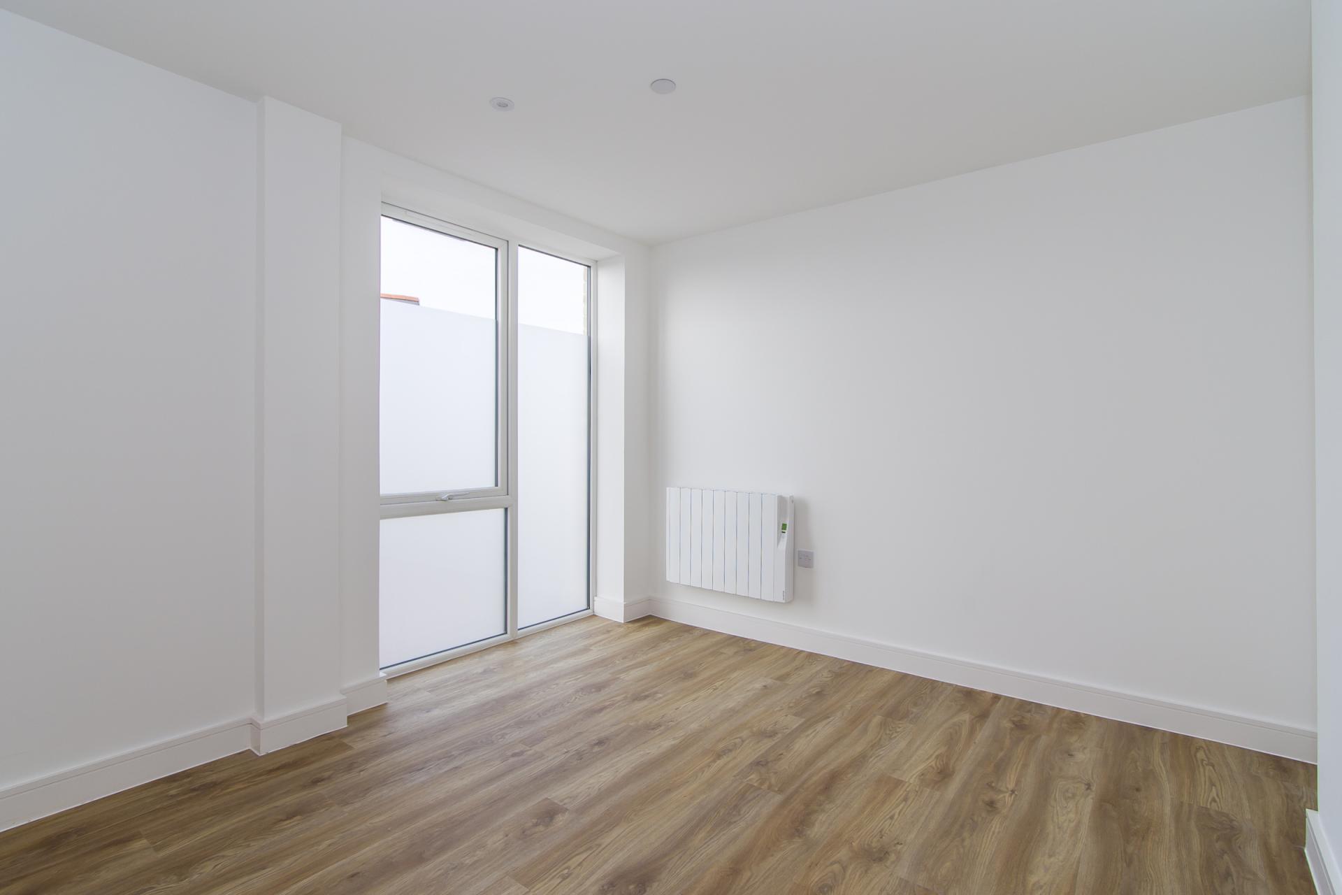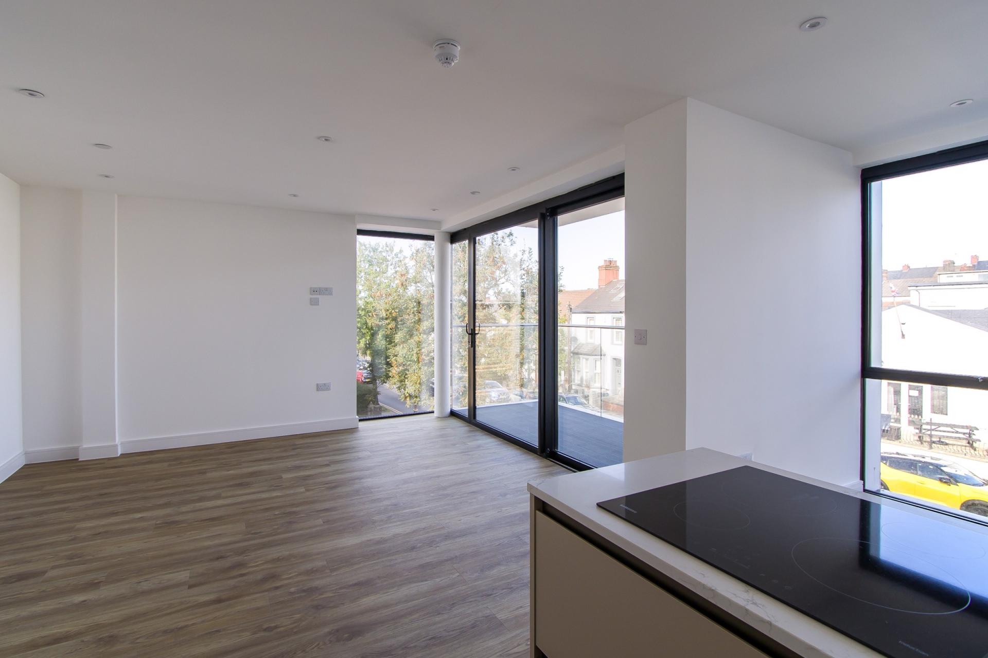 An open plan living and dining space with kitchen, and sliding doors that front onto the Windsor Road and open onto the balcony. The premium Avana kitchen is finished with black matt trim and comprehensive integrated Samsung appliances including an electric oven, combi microwave, four zone induction hob, extractor, fridge freezer and dishwasher. LVT flooring throughout. Wall mounted electric heater. Power, TV and data points. Recessed lights.