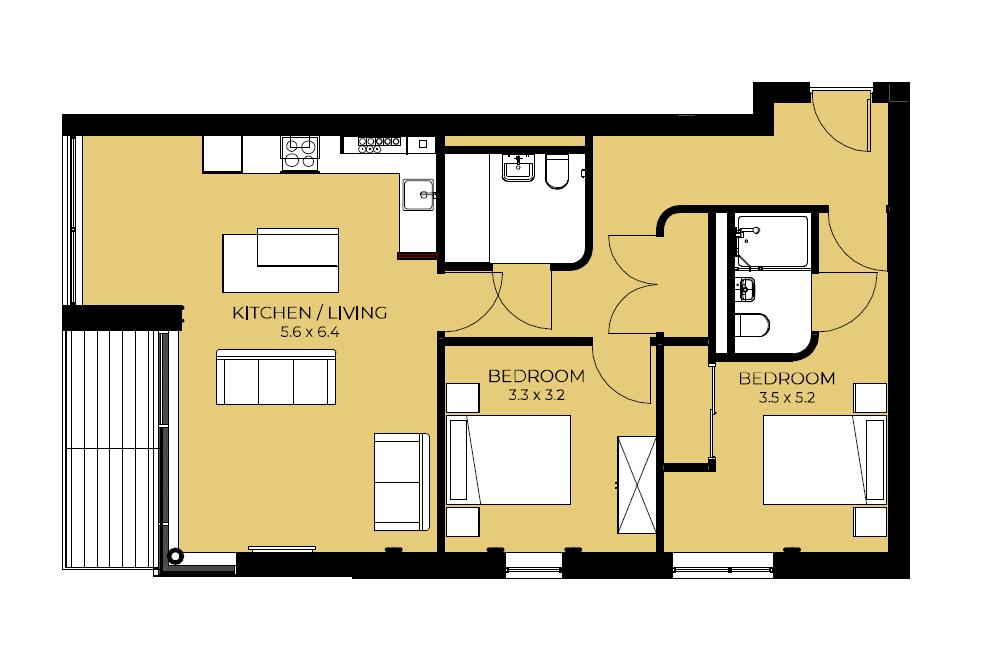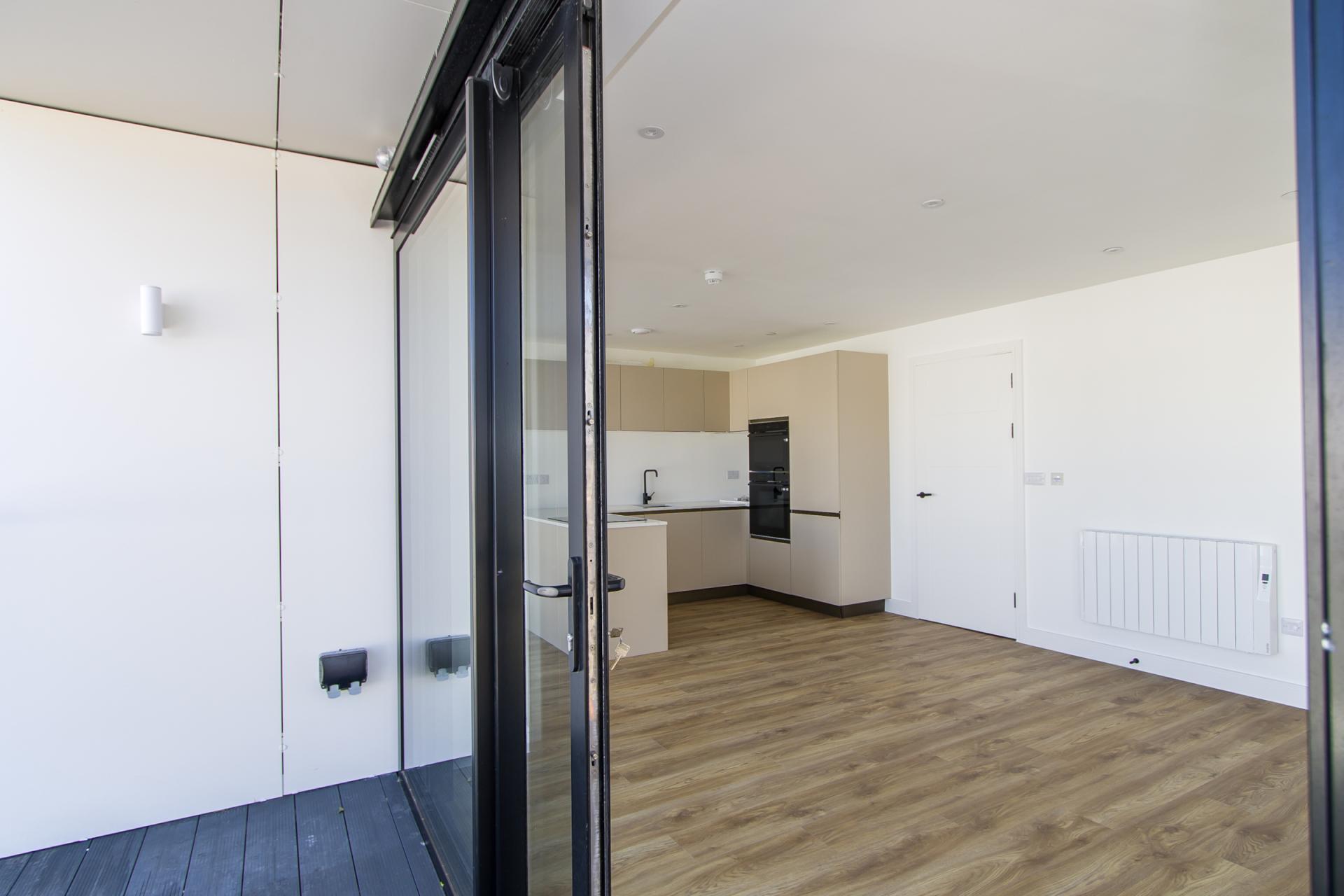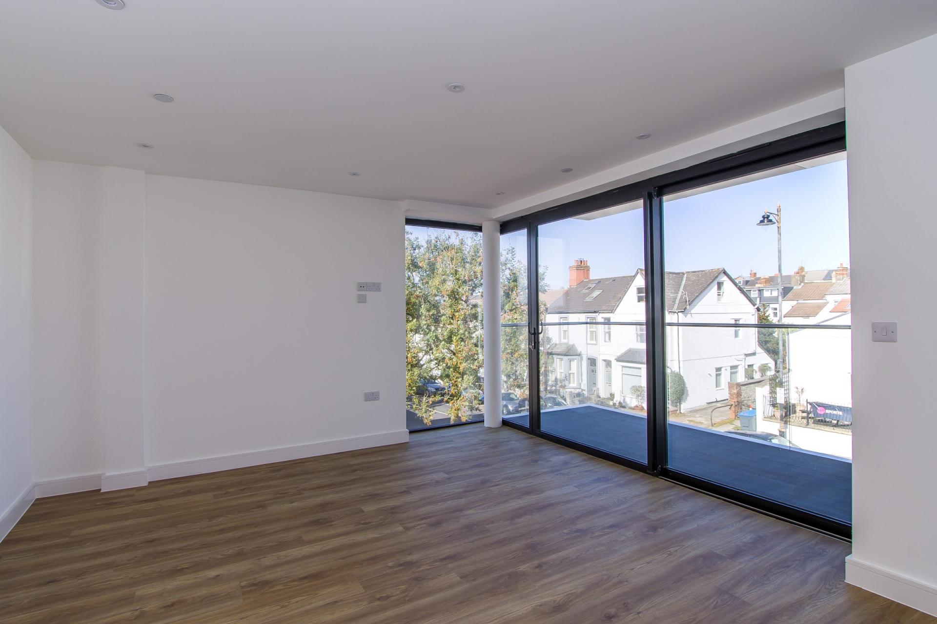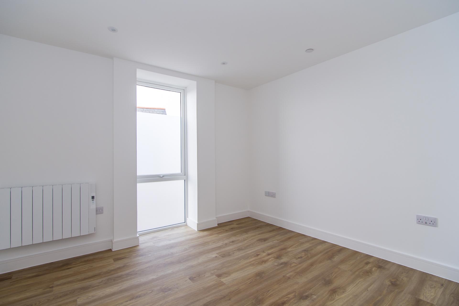 An open plan living and dining space with kitchen, and sliding doors that front onto the Windsor Road and open onto the balcony. The premium Avana kitchen is finished with black matt trim and comprehensive integrated Samsung appliances including an electric oven, combi microwave, four zone induction hob, extractor, fridge freezer and dishwasher. LVT flooring throughout. Wall mounted electric heater. Power, TV and data points. Recessed lights.