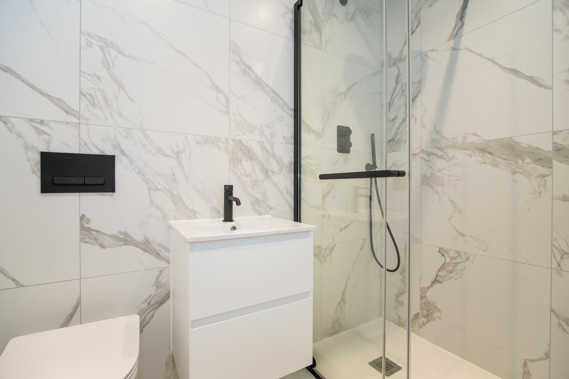 A Mandarin Stone tiled bathroom with Tissano bathroom suite comprising a shower cubicle with twin head mixer shower, a WC and wash hand basin with vanity unit. Recessed lights. Extractor fan. Electric heated towel rail.