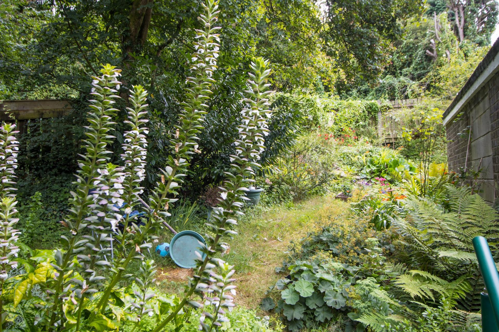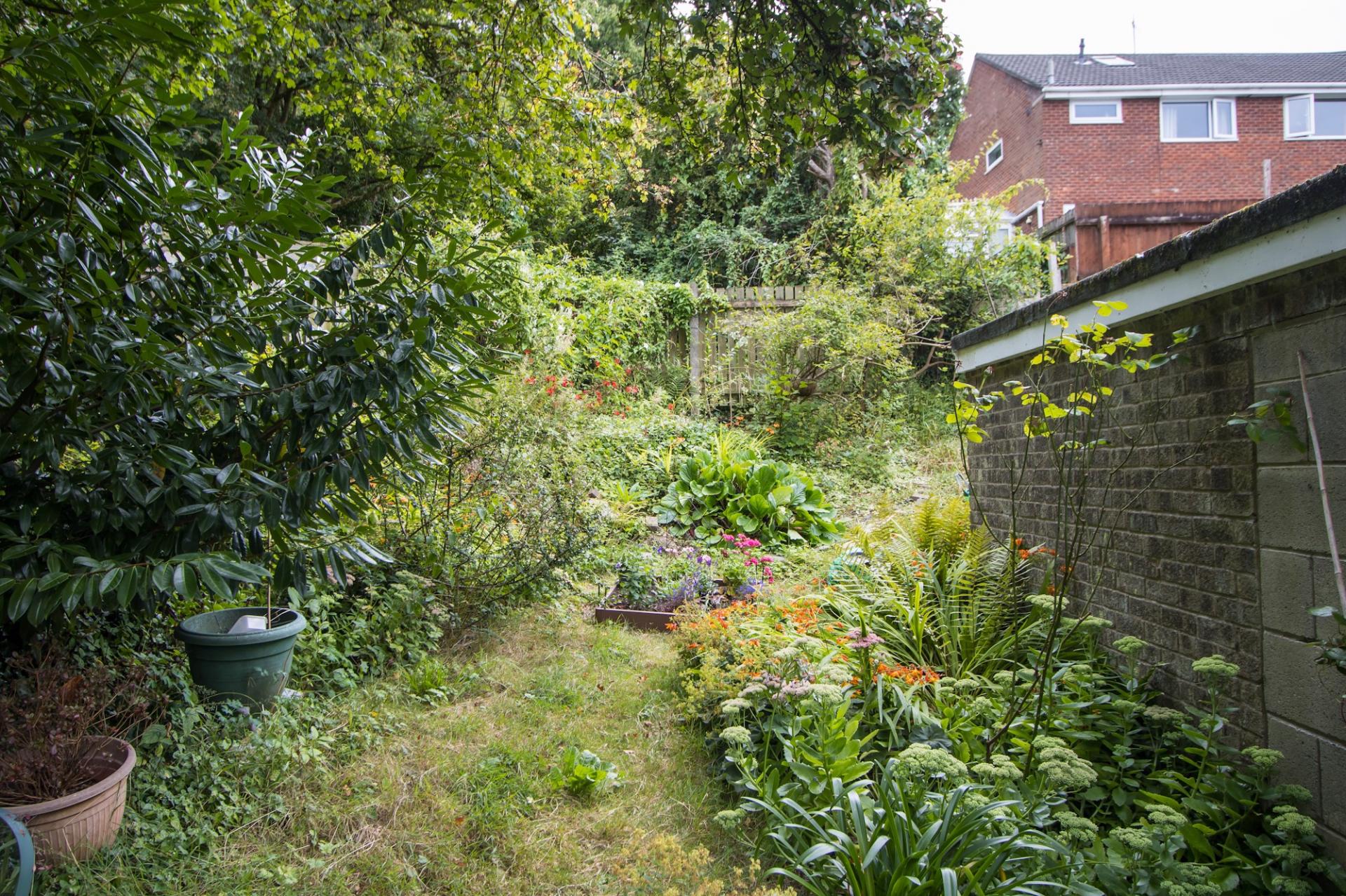 An enclosed rear garden with a southerly aspect, mature and full of various plants, trees and shrubs. Patio directly accessed from the rear of the house, which steps up into a lawn. Gated access to the side onto the driveway, and to the front on the other side of the house.