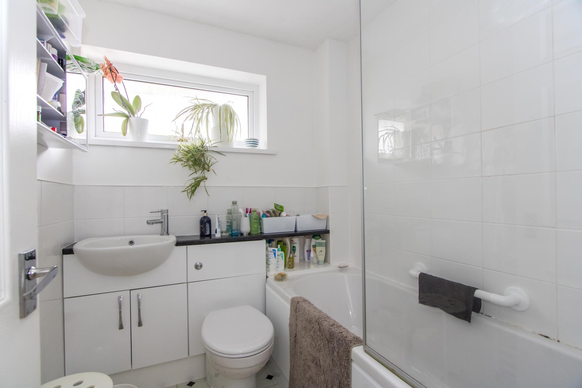 Vinyl floor tiles. Suite comprising a panelled bath with mixer shower, WC and wash hand basin with storage below. High level uPVC double glazed window. Part tiled walls. Extractor fan.