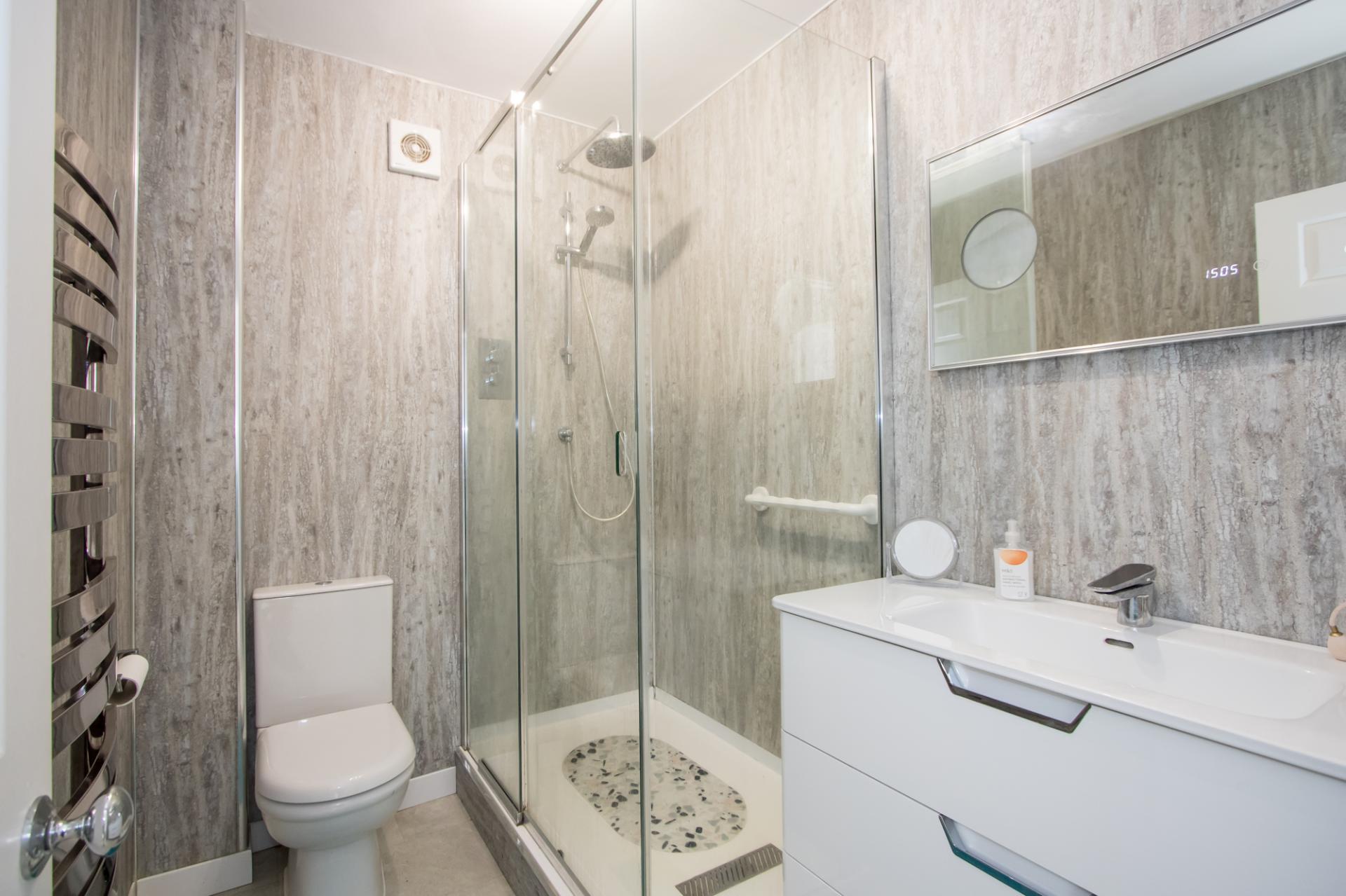Suite comprising a shower cubicle with mixer shower, WC and wash hand basin with storage below. Heated towel rail. Extractor fan. Fitted mirror with lights.