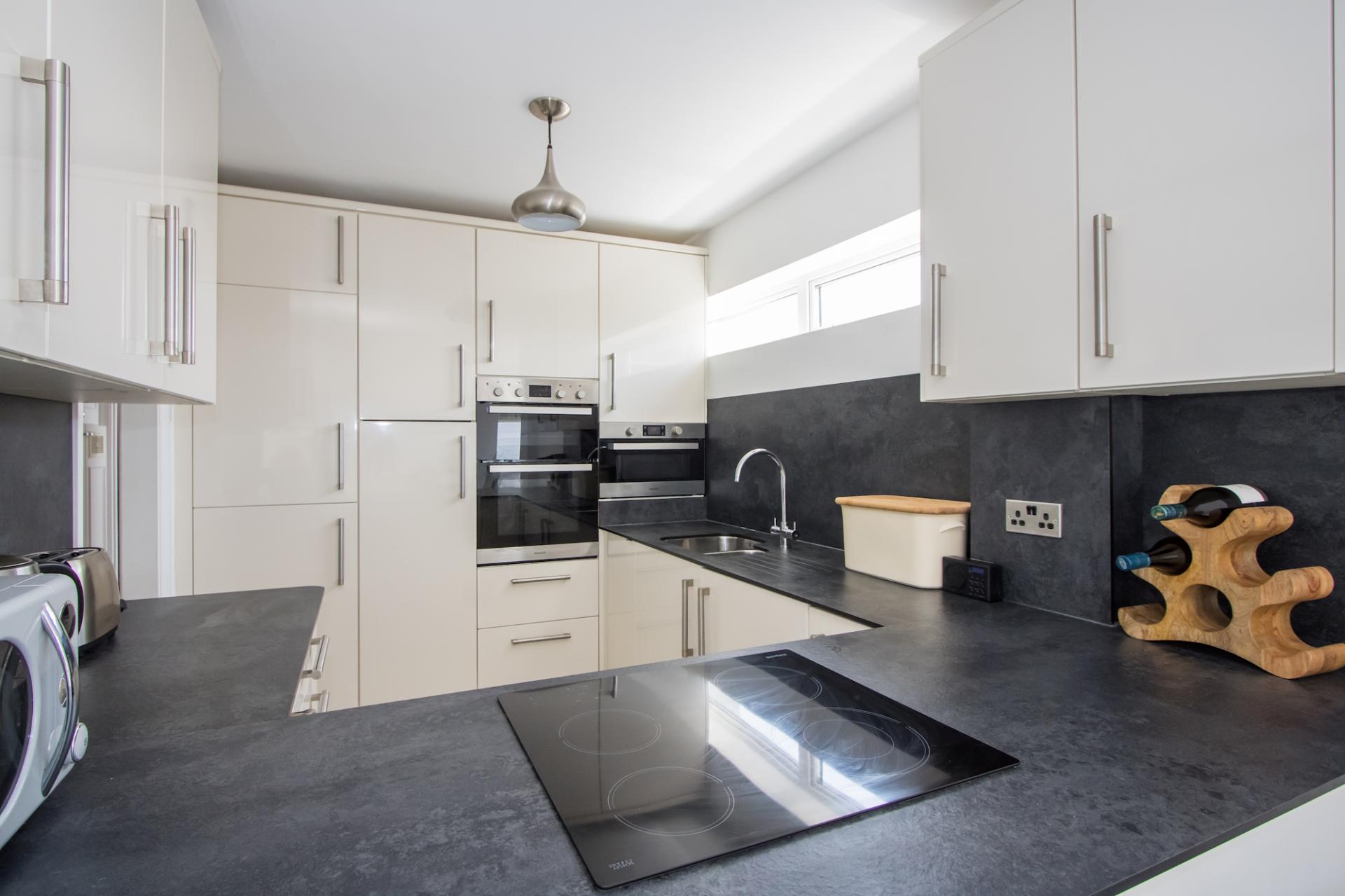 Tiled floor. A comprehensively fitted kitchen comprising wall units and base units with cream gloss doors and granite effect work surface. Integrated appliances including an electric oven, grill, microwave, four zone induction hob, fridge, freezer and washing machine. One and a half bowl countersunk sink with drainer. Open to the kitchen. Two high level windows.