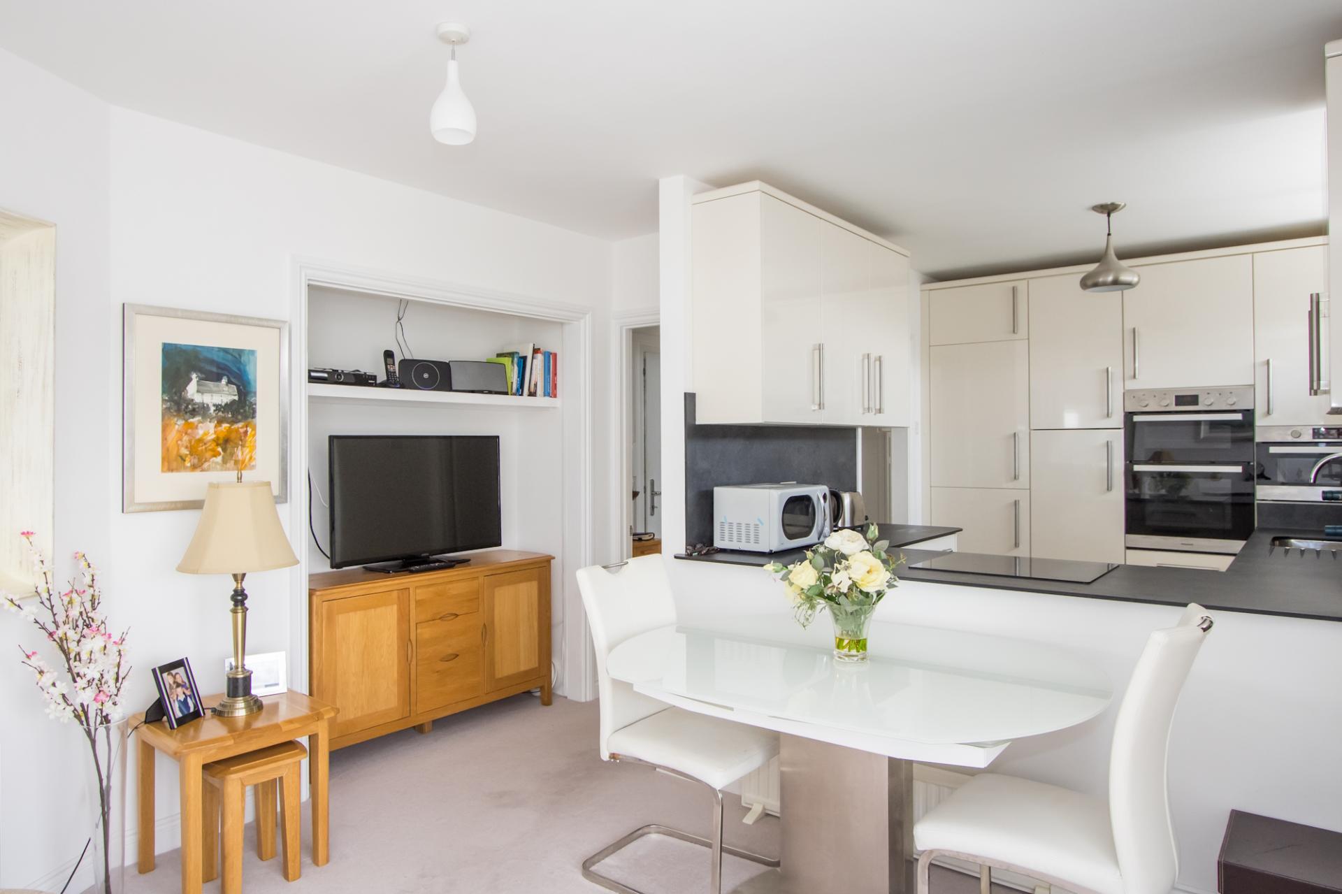 Entered via a new composite front door from the communal landing. Tiled flooring and matching doors to the living room, kitchen, bathroom and bedroom. Two built-in cupboards, one with the hot water cylinder. Central heating radiator. Recessed lights. Power points. Phone point. Door entry phone.