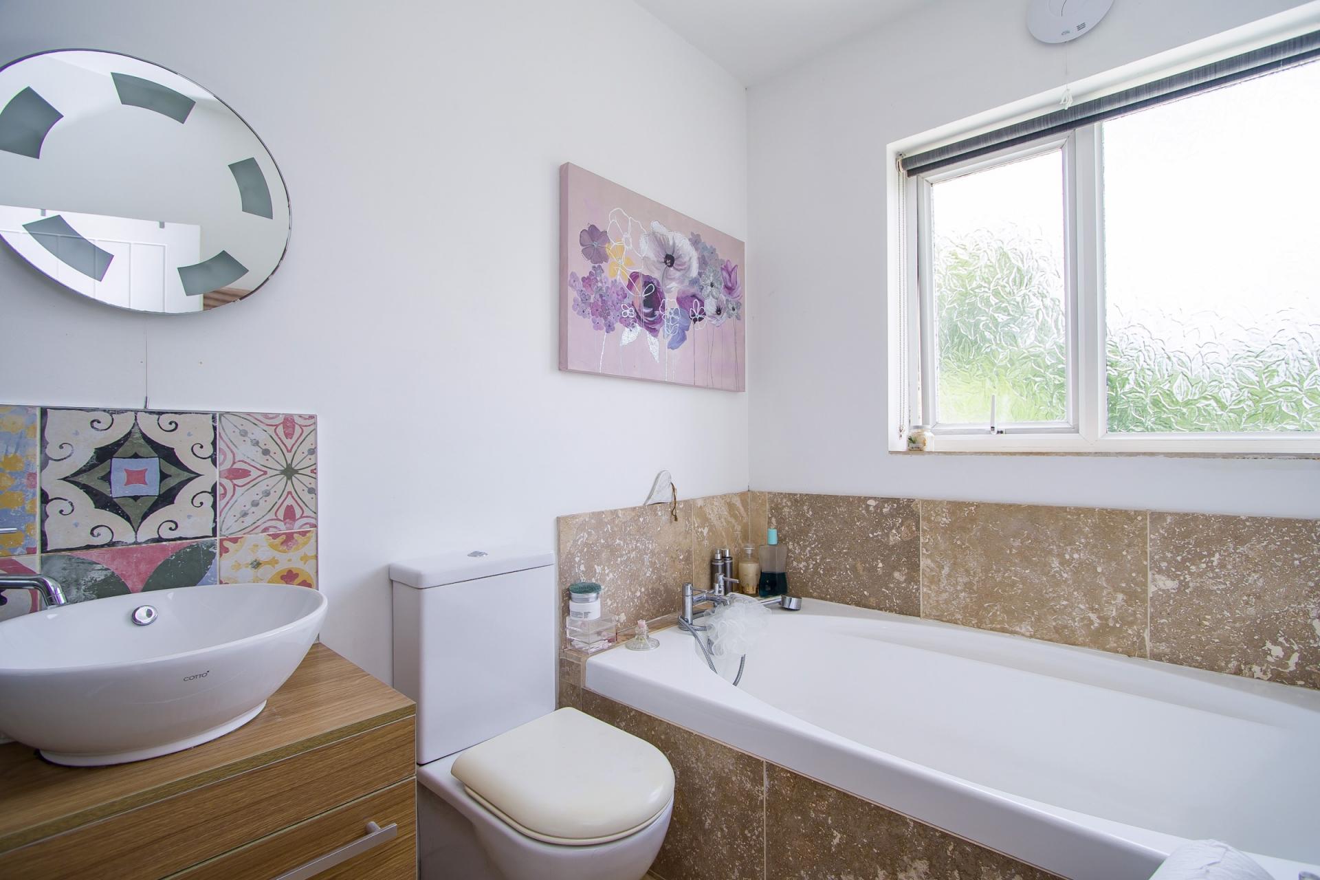 Tiled floor. WC and sink. High level uPVC double glazed window to the side. Heated towel rail. Extractor fan.