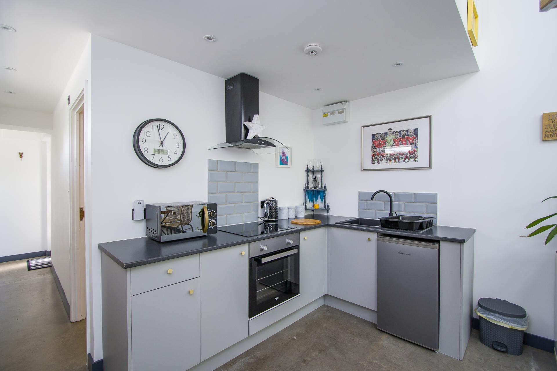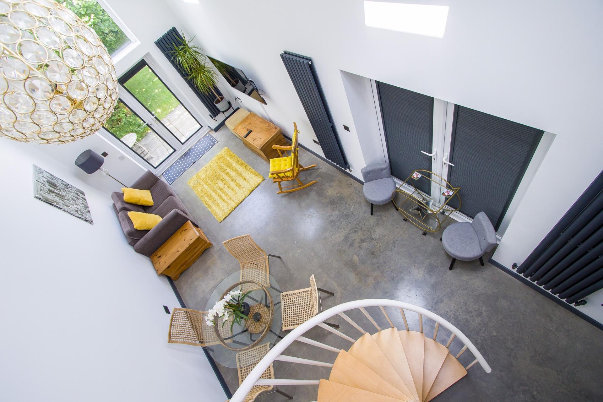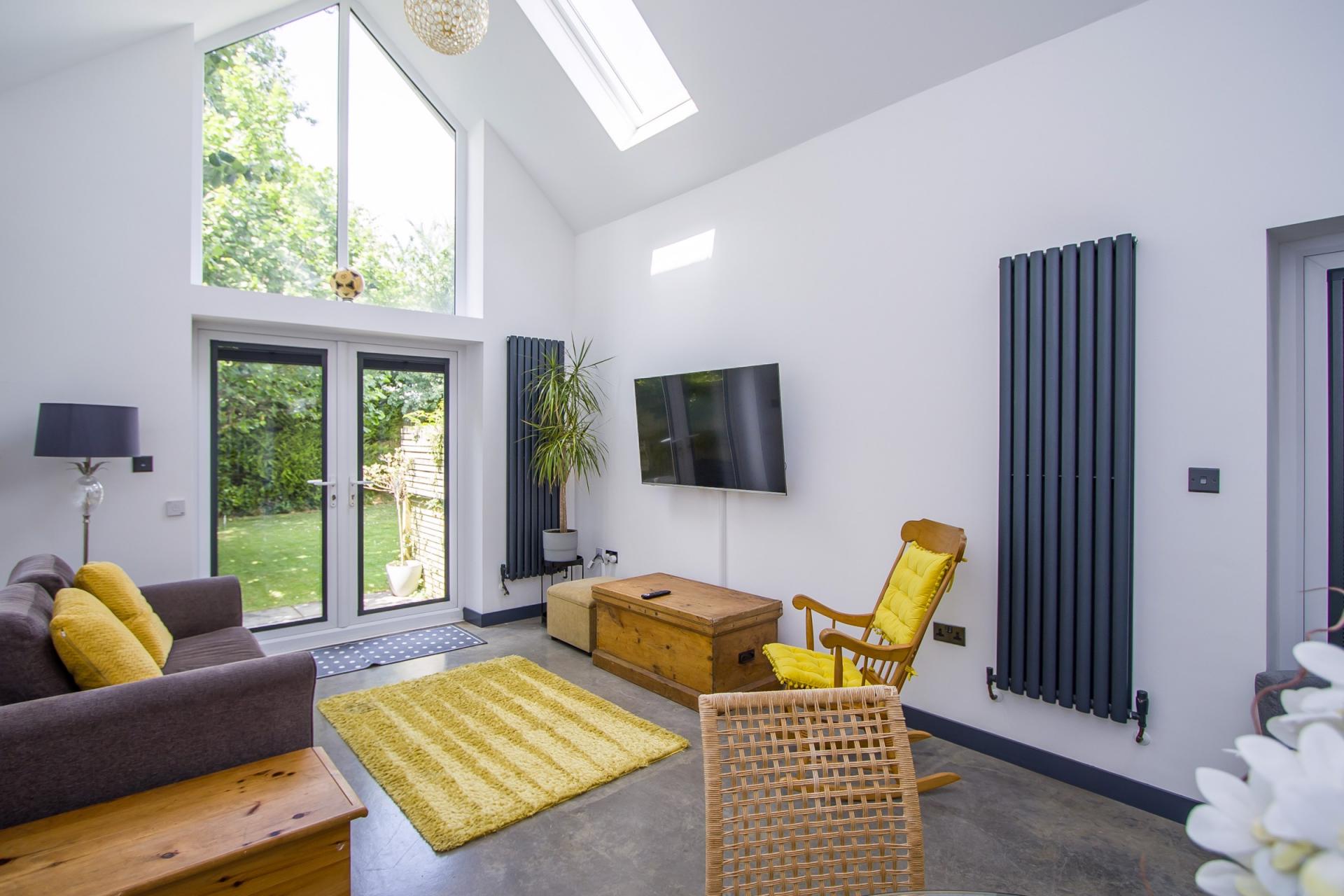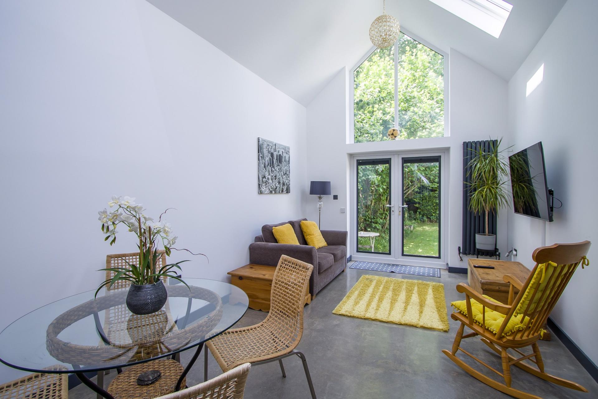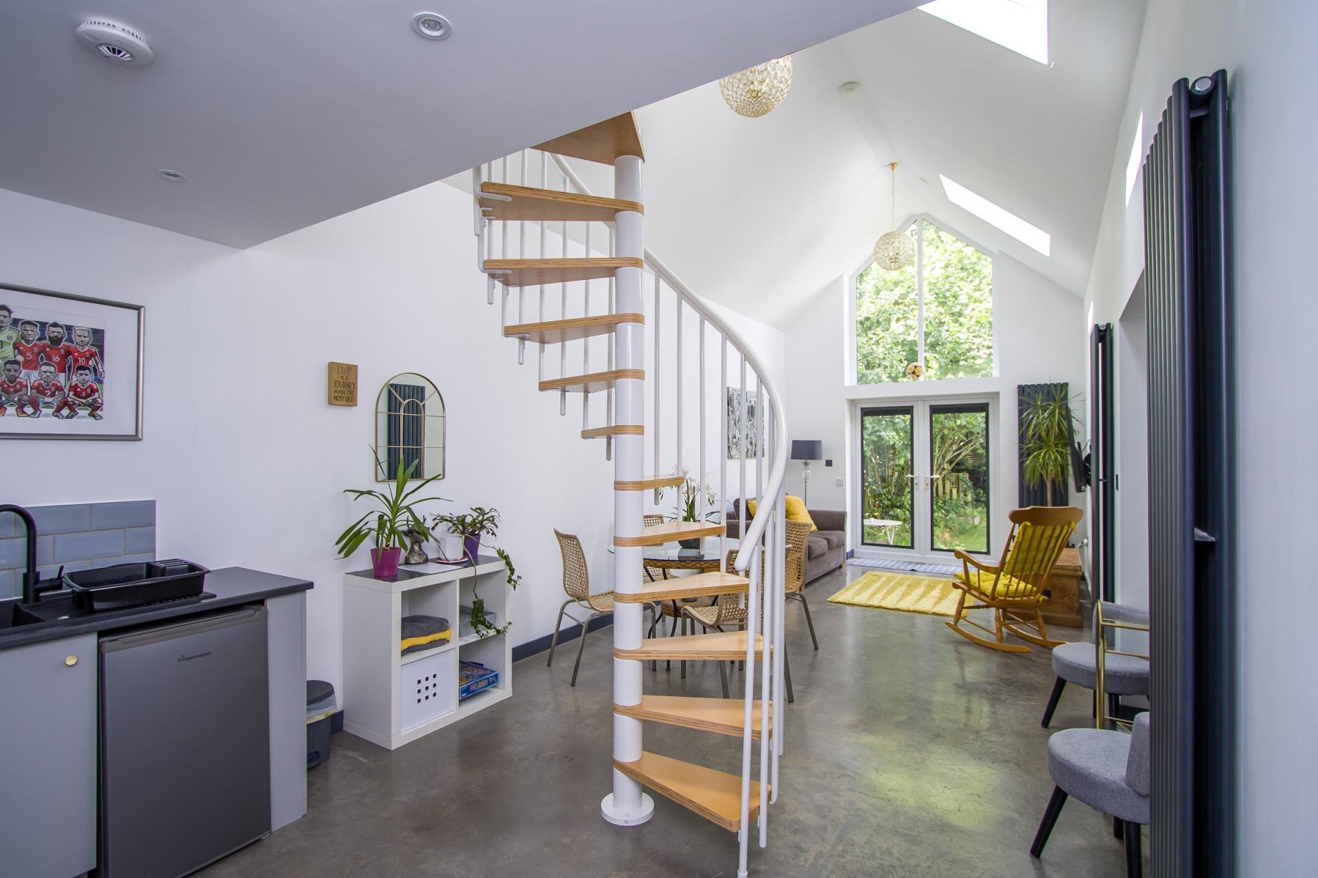 A fantastic open plan space that forms the main living area of what could be a completely self-contained annex, but would also just be extended living space for the main house. Polished concrete flooring. Double glazed patio doors to the side and rear, with the rear doors opening onto a small section of private garden. Two Velux windows. Three tall central heating radiators. Power points and TV point. A fitted kitchen with base cupboards, laminate work surfaces, an electric oven, four zone electric hob, extractor hood, sink with drainer and a space for a counter level fridge. Recessed lights. Spiral staircase up to the mezzanine.