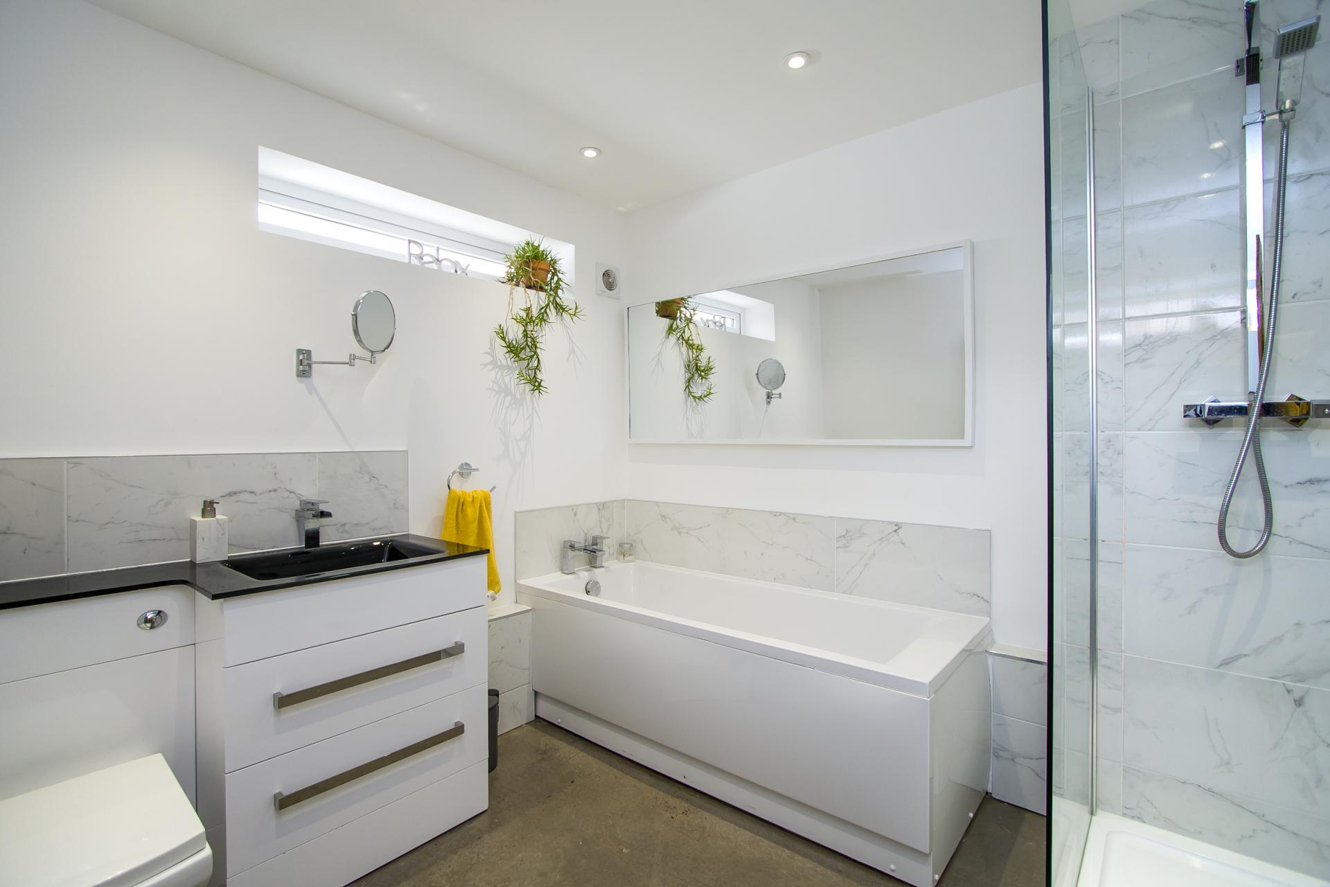 Polished concrete flooring and part tiled walls. Suite comprising a walk-in shower with twin head mixer shower, panelled bath, WC and sink with storage below. High level uPVC double glazed window. Heated towel rail. Recessed lights. Extractor fan.