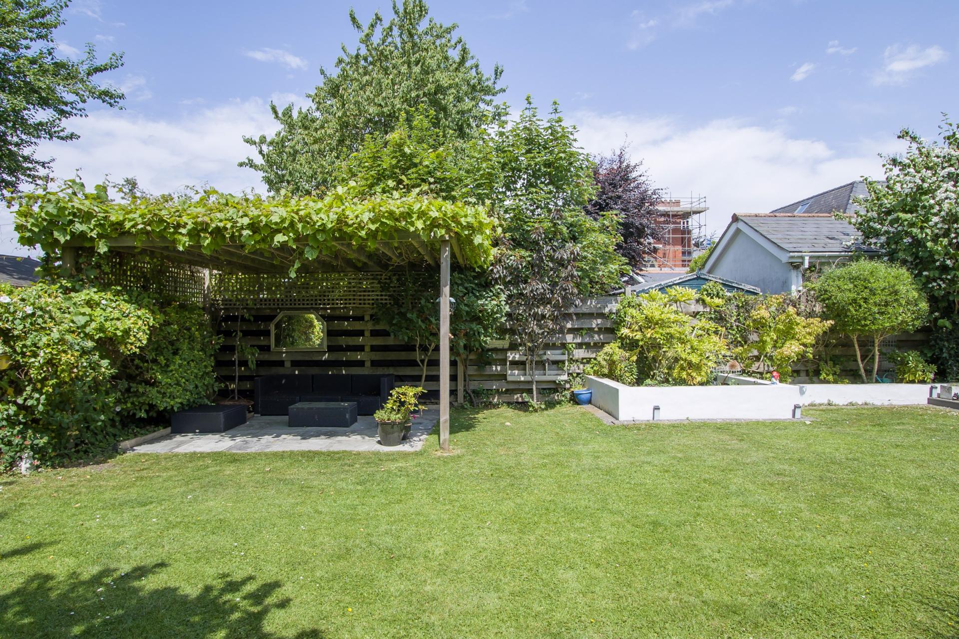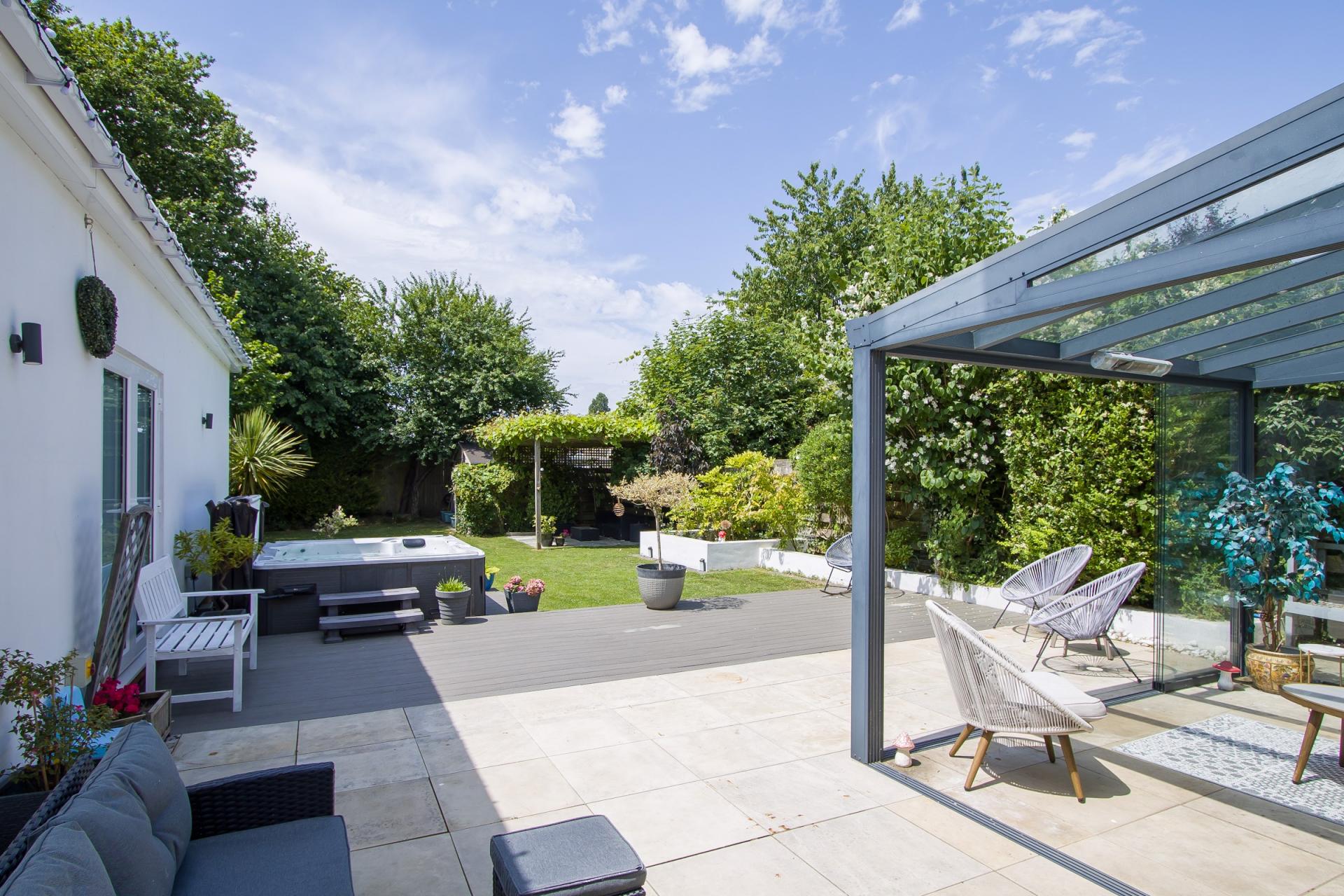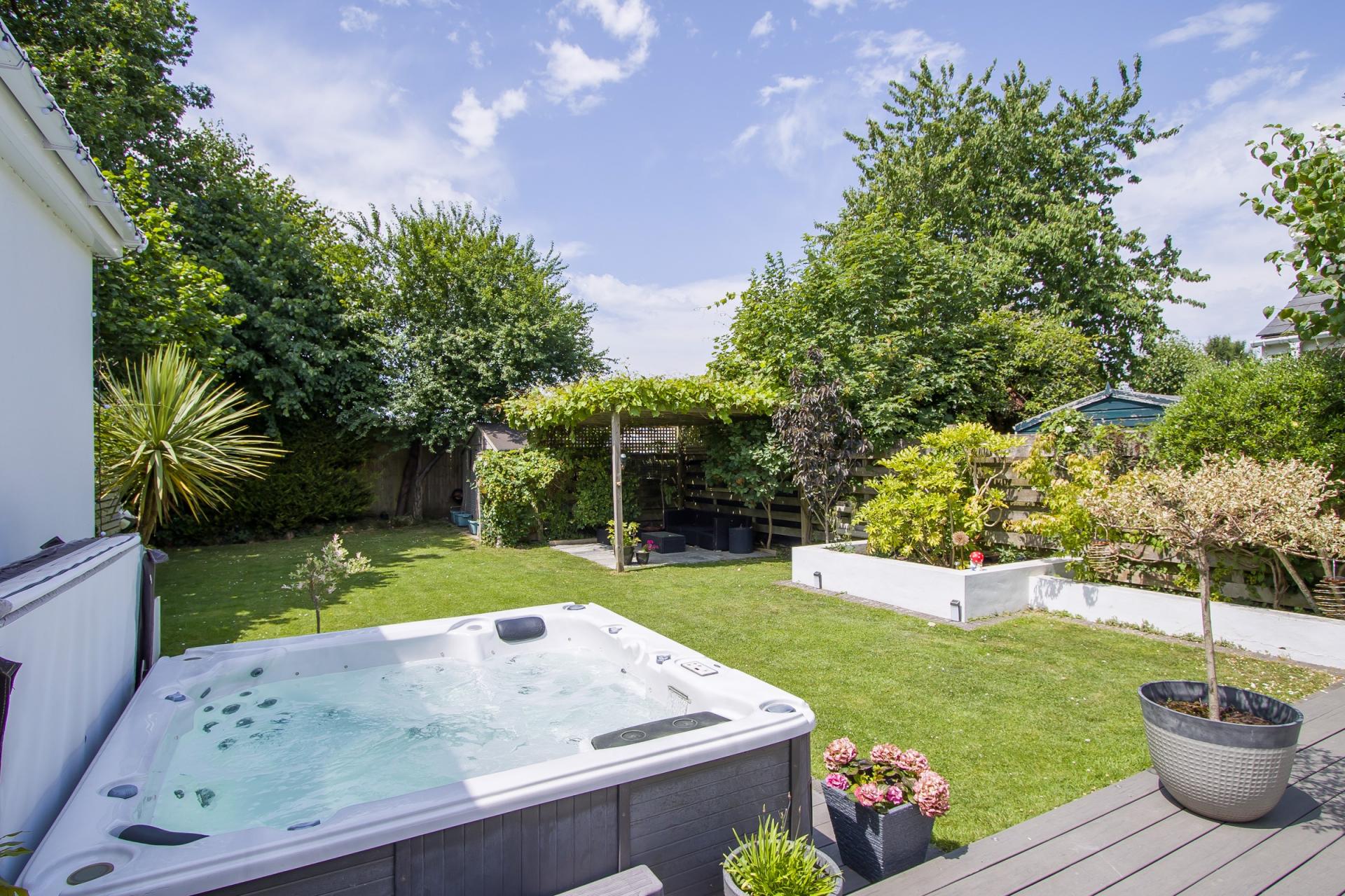 An fabulously well-sized family garden, private, mature and with a very sunny westerly aspect. The garden has a large stone patio accessed from the kitchen / diner with a superb garden room (3.45m x 3.6m) that has electric light, glazed roof and glazed sliding doors into the garden. The patio moves on to a composite decked terrace with hot tub and plenty of additional sitting space. The lawn comes next, and is an excellent size with loads of room for games of all kinds. There are raised beds to one side, a shady vine-covered pergola, large shed and a partially separate garden area for the annex. The garden has outside lights, power points and tap. This is a very special garden.
