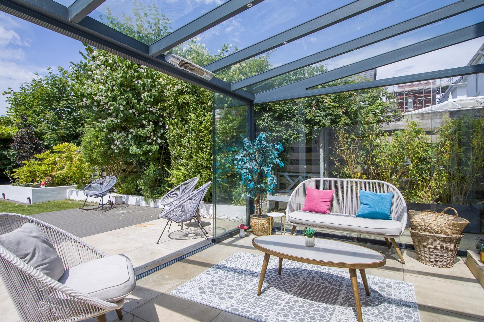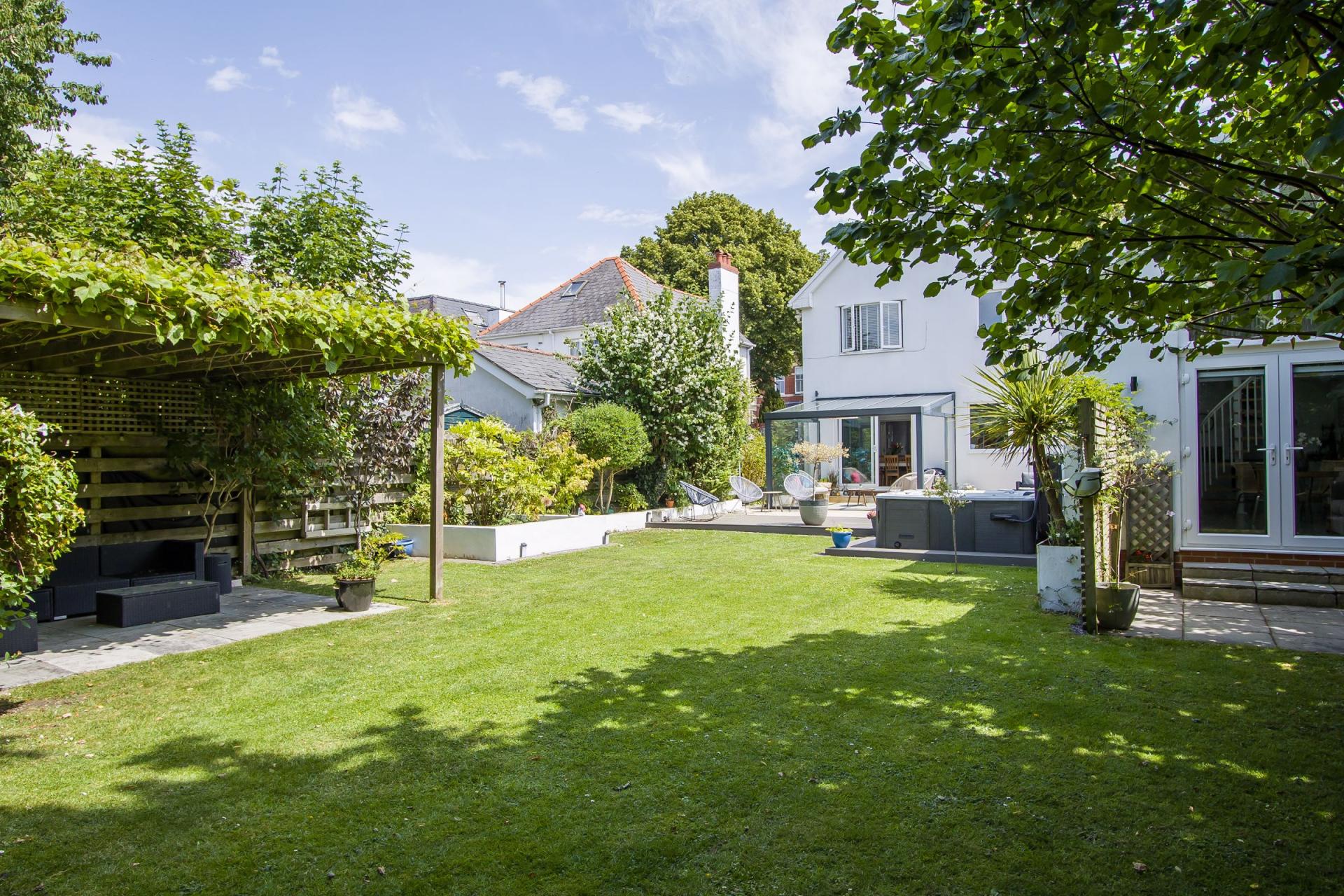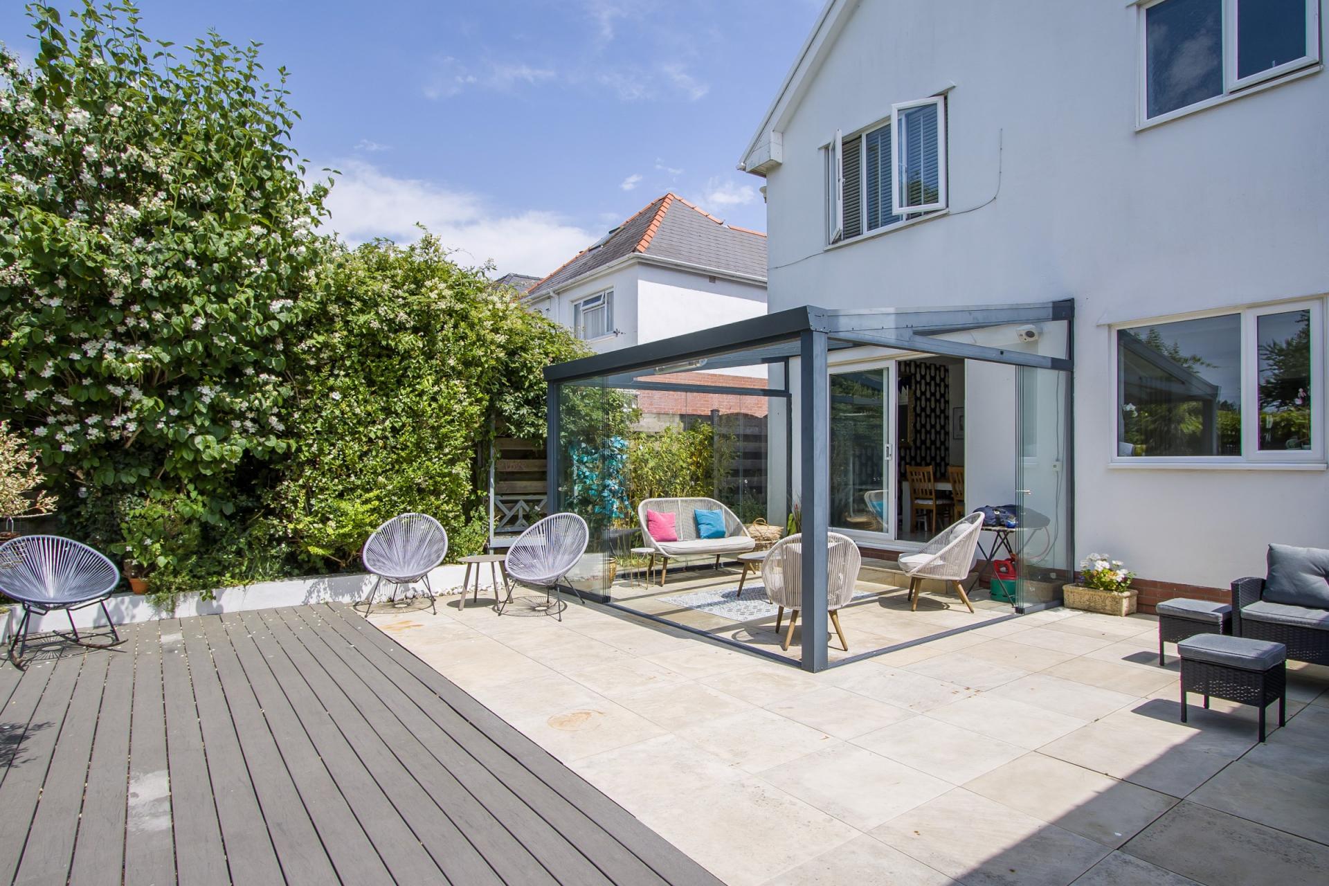 An fabulously well-sized family garden, private, mature and with a very sunny westerly aspect. The garden has a large stone patio accessed from the kitchen / diner with a superb garden room (3.45m x 3.6m) that has electric light, glazed roof and glazed sliding doors into the garden. The patio moves on to a composite decked terrace with hot tub and plenty of additional sitting space. The lawn comes next, and is an excellent size with loads of room for games of all kinds. There are raised beds to one side, a shady vine-covered pergola, large shed and a partially separate garden area for the annex. The garden has outside lights, power points and tap. This is a very special garden.
