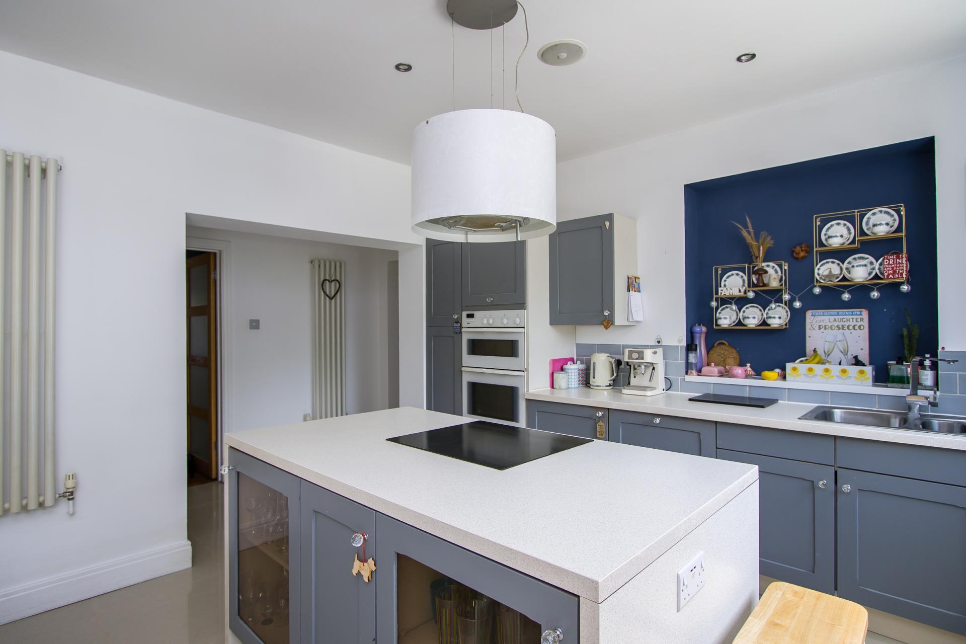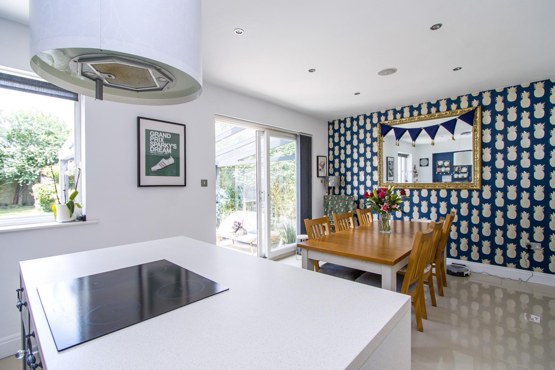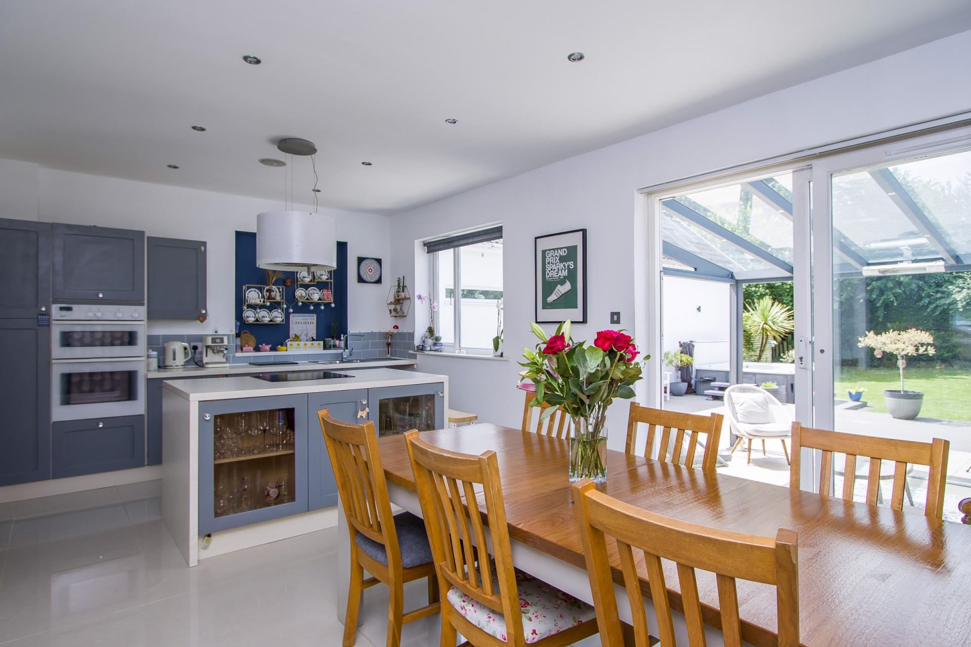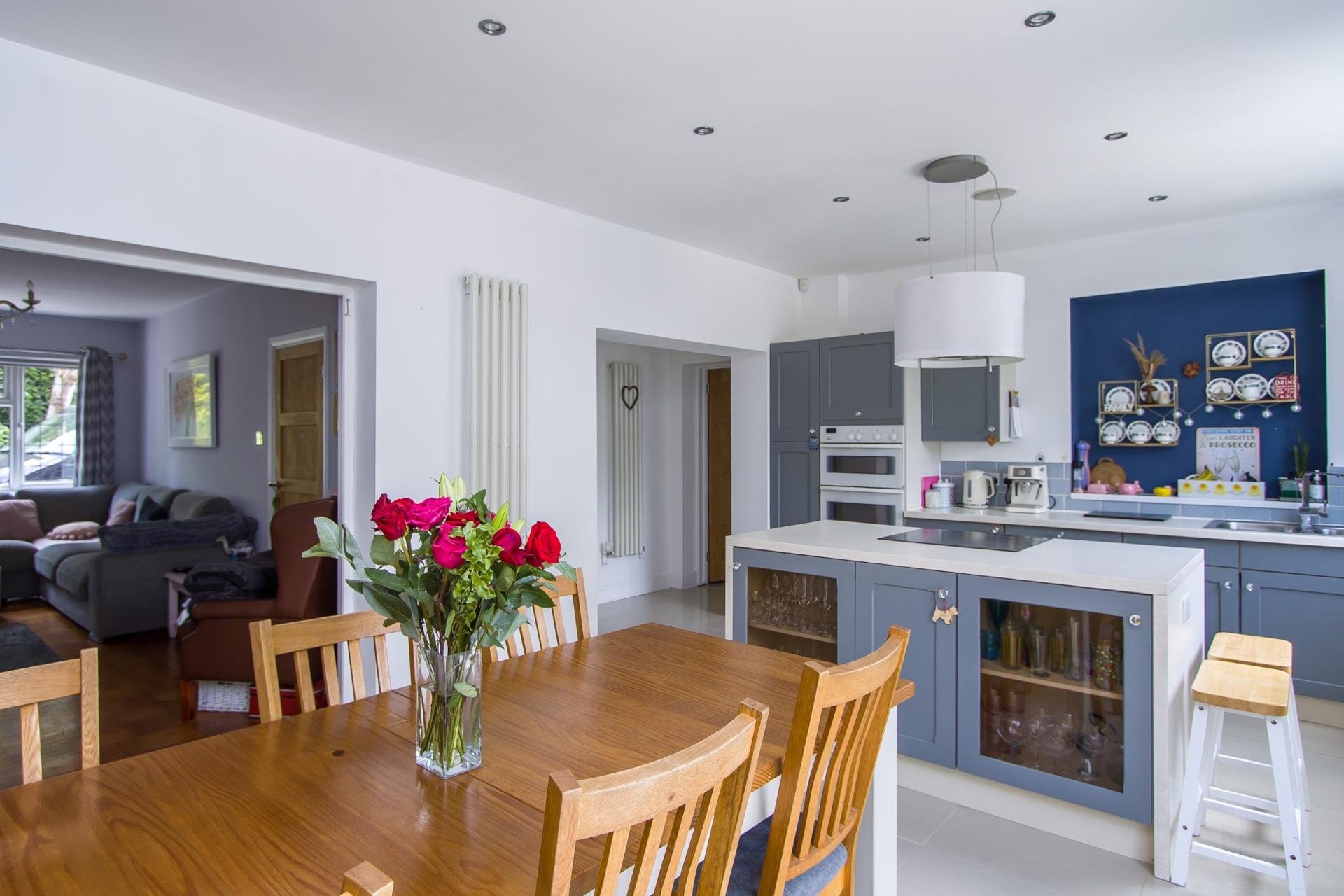 An excellent open plan family space to the rear of the house that opens into the garden room. Tiled flooring throughout. Fitted kitchen comprising a mixture of wall units and base units with laminate work surfaces. Integrated appliances including a four zone induction hob, oven, grill, extractor fan, dishwasher and counter level fridge. One and a half bowl stainless steel sink with drainer. Recessed lights and extractor speakers.