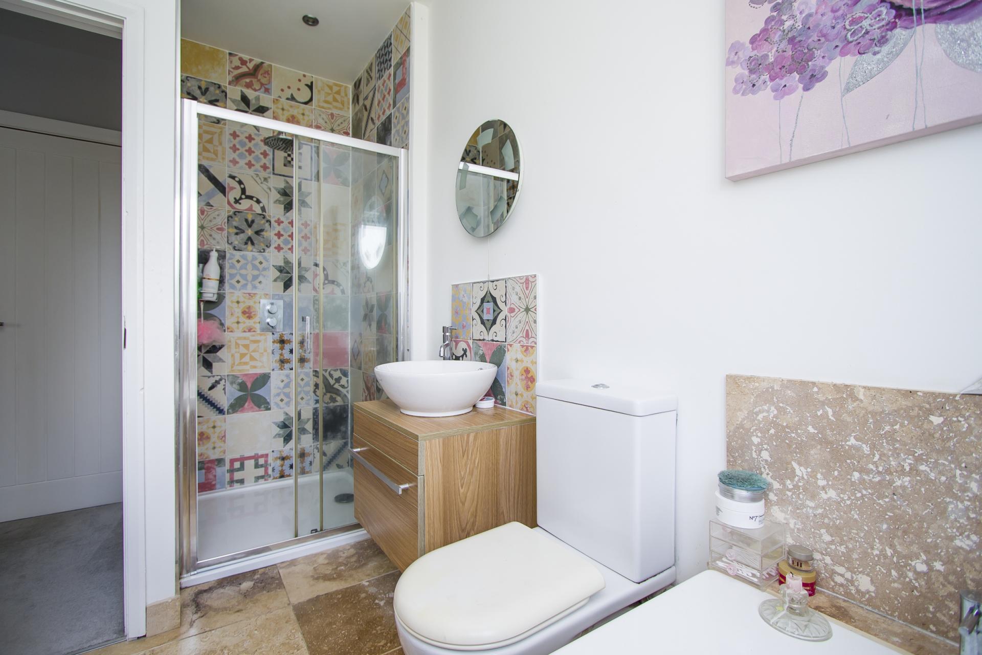 A spacious family bathroom with a suite comprising of a corner bath with hand shower fitting, shower cubicle with overhead mixer shower, WC and sink. Tiled floor and part tiled walls. uPVC double glazed window to the rear. Heated towel rail. Recessed lights. Extractor fan.