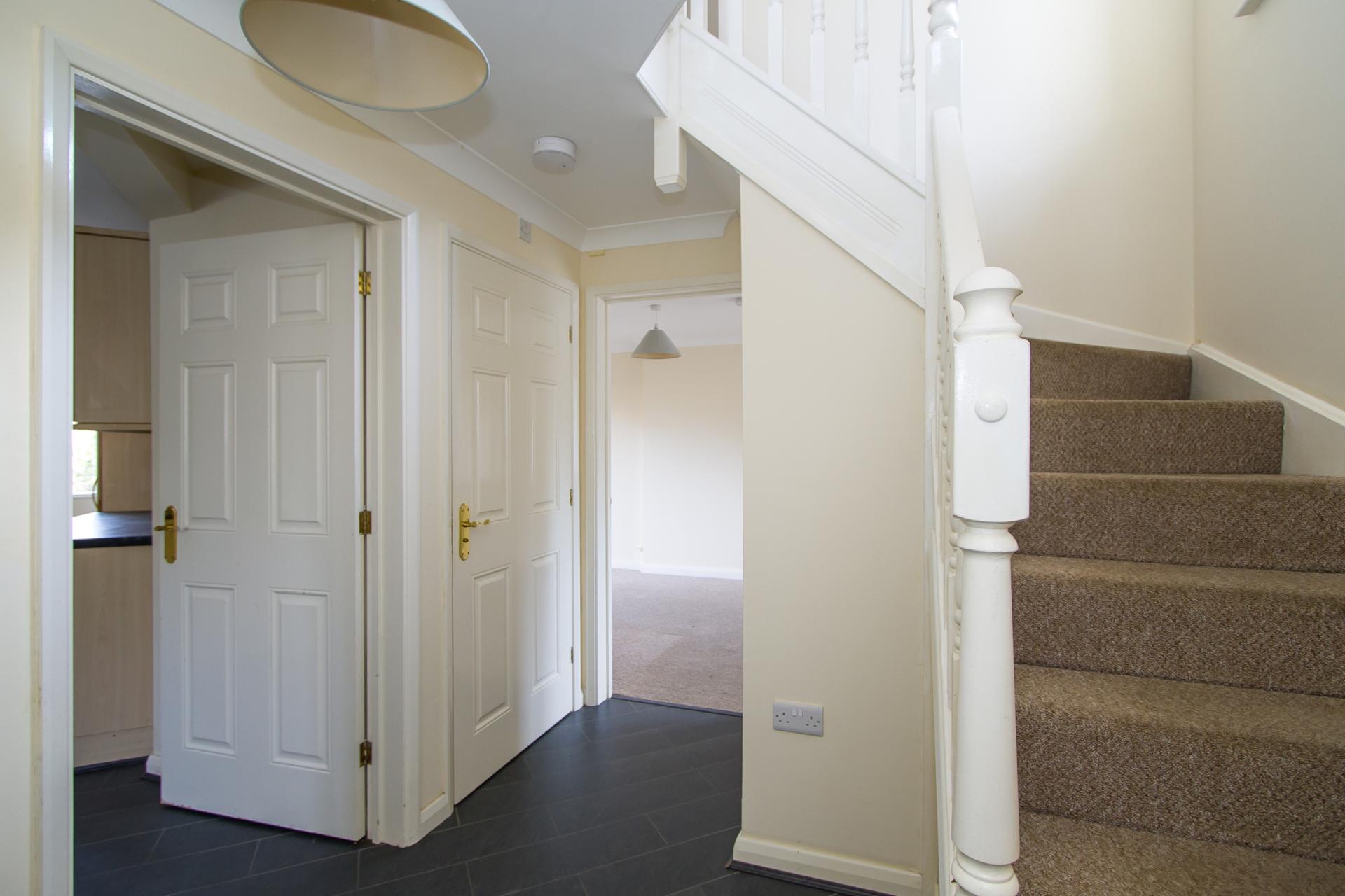 Composite front door with double glazed panels. Tiled floor. Central heating radiator. Stairs to the first floor with under stair cupboard. Doors to the living room, kitchen / diner and WC. Power points. Coved ceiling.