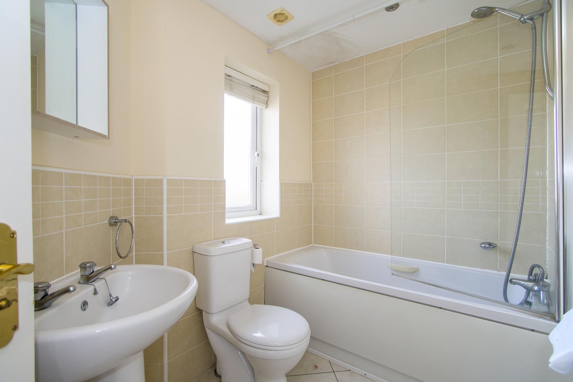 Tiled floor and part tiled walls. Suite comprising a panelled bath with mixer shower and glass screen, a WC and a pedestal sink. Central heating radiator. uPVC double glazed window to the rear. Fitted mirror. Recessed lights and extractor fan.