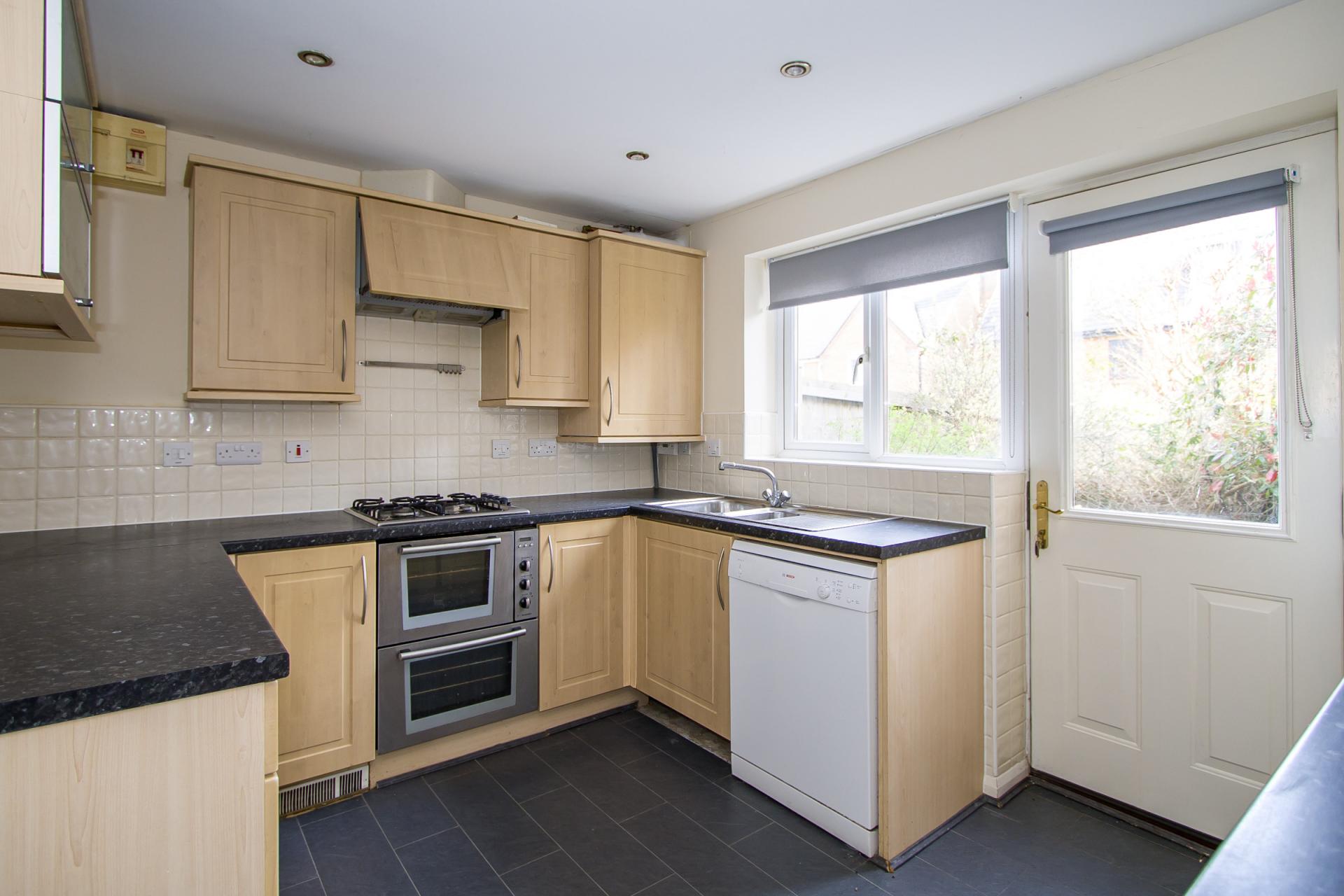 A partly open kitchen / diner with tiled flooring throughout, continued from the hall. Fitted kitchen comprising wall units and base units with laminate work surfaces and tiled splashbacks. Integrated appliances including an electric oven and grill, four burner gas hob, extractor hood, fridge freezer and washing machine. Freestanding dishwasher. One and a half bowl stainless steel sink with drainer. uPVC double glazed windows to the front and rear as well as a door to the rear into the garden. Coved ceiling and recessed lights throughout. Central heating radiator. Power points. Ample space for a dining table and chairs.