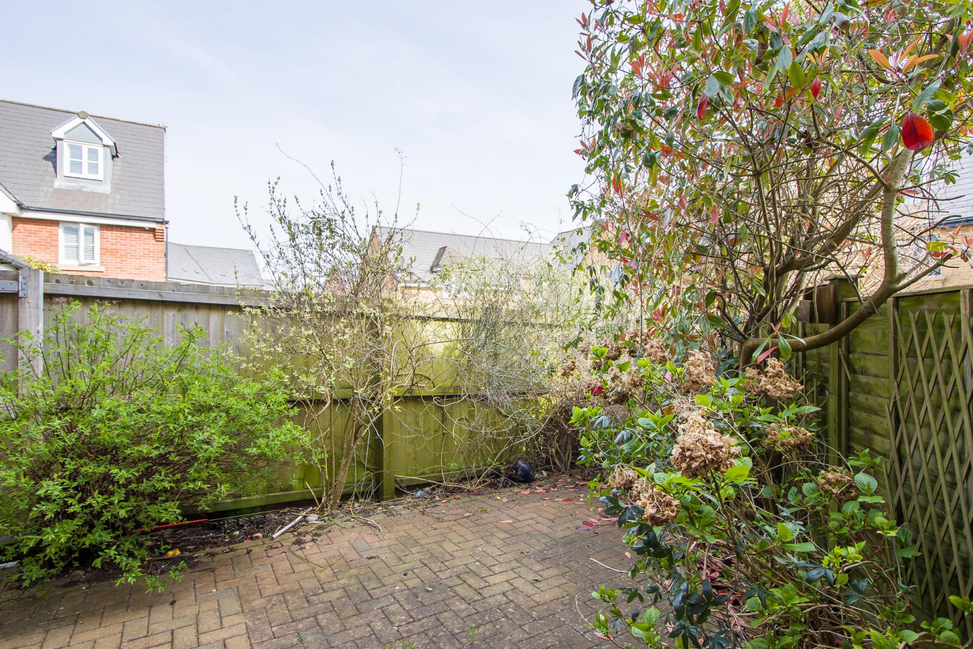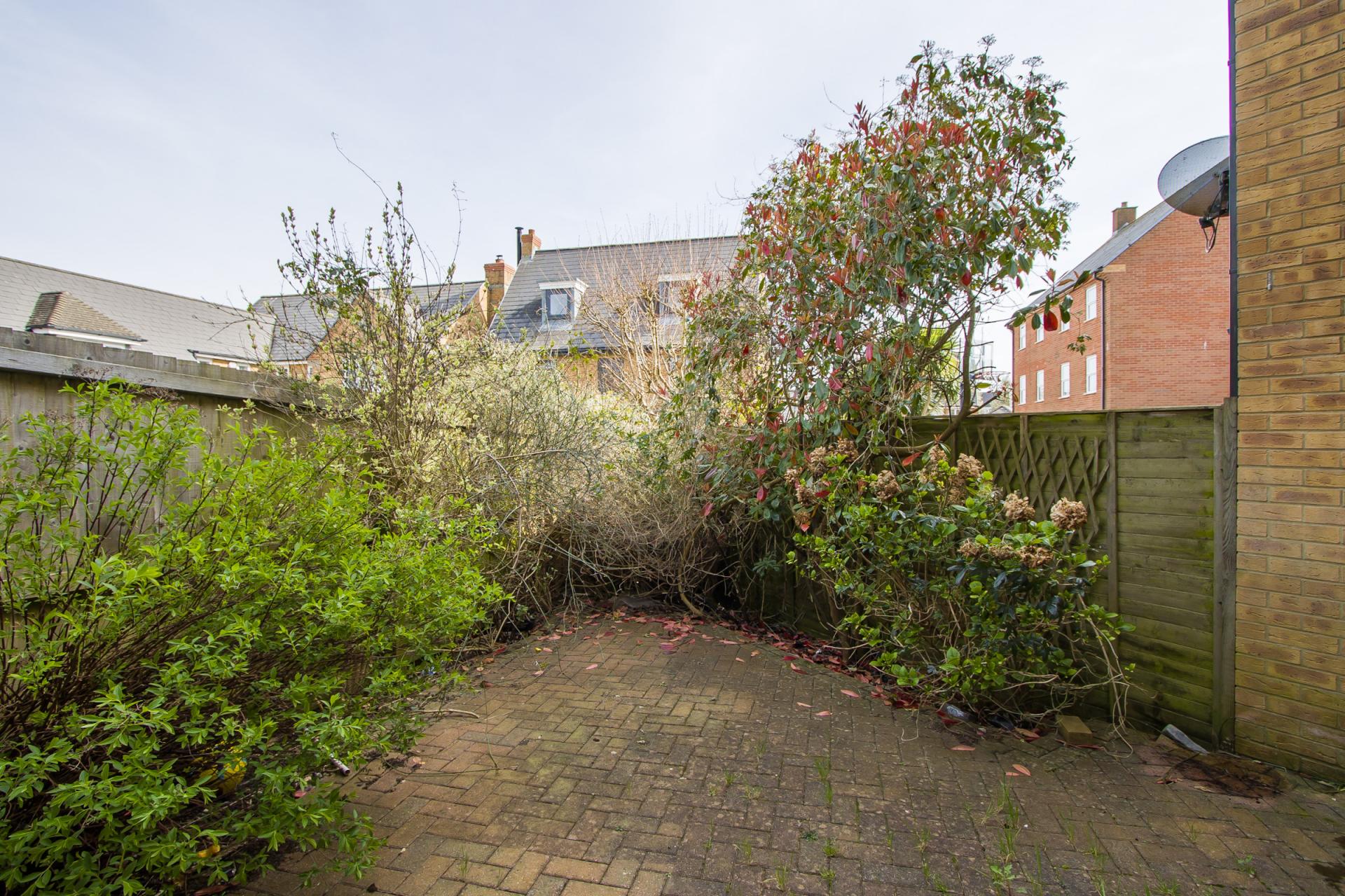 A block paved patio garden with gated access to the side. Outside tap. Mature planting to two sides.