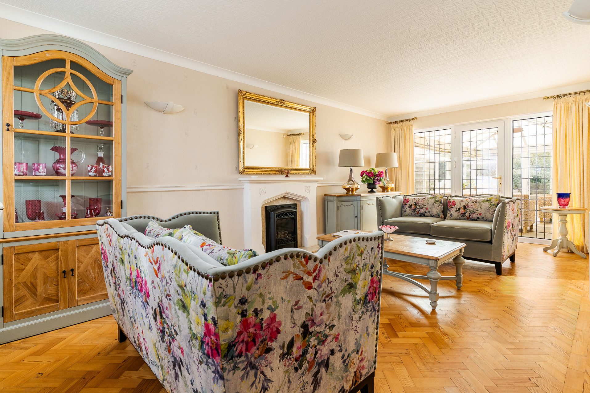 A very spacious living room with wood block flooring that continues from the hall. uPVC double glazed bay window to the front and doors and windows to the rear into the conservatory. Dado rails and coved ceilings. Two central heating radiators. Power points. Stone fireplace with gas fire.