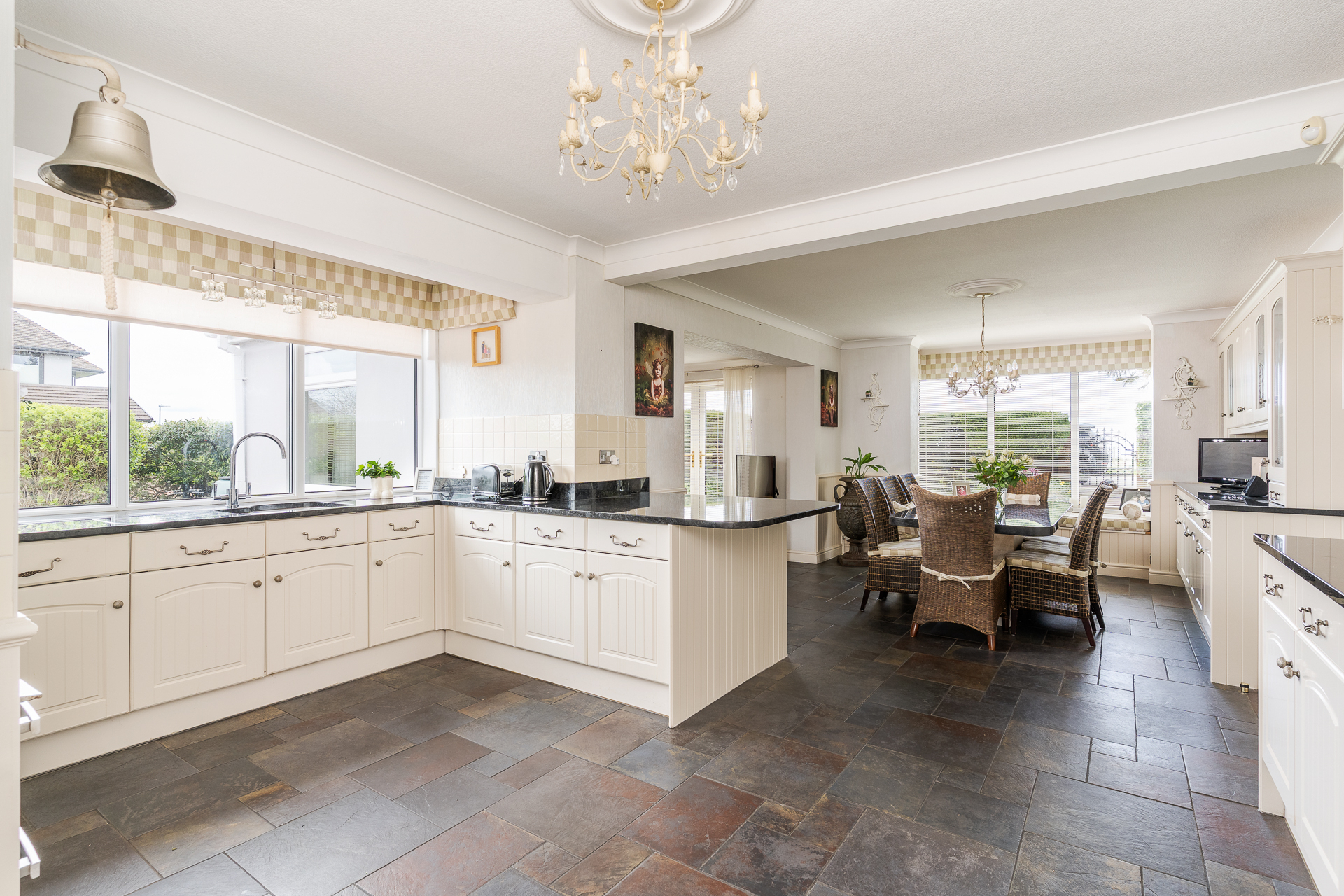 A large kitchen / dining / living space at the front of the property and with potential for water views over the Bristol Channel. Tiled floor throughout. Fitted kitchen comprising wall units and base units with black granite work surfaces. Freestanding range cooker with double electric oven, grill, warming drawer and a six zone electric hob. Extractor hood. Integrated appliances including a dishwasher and a full height fridge and freezer. One and a half bowl countersunk stainless steel sink with drainer. There are windows to the side, rear and to the front along with double doors that give access into the front garden. Fitted Venetian blinds to the front and rear and Roman blinds on the side windows. Power points and TV point. There is a door to the rear into the side lobby.