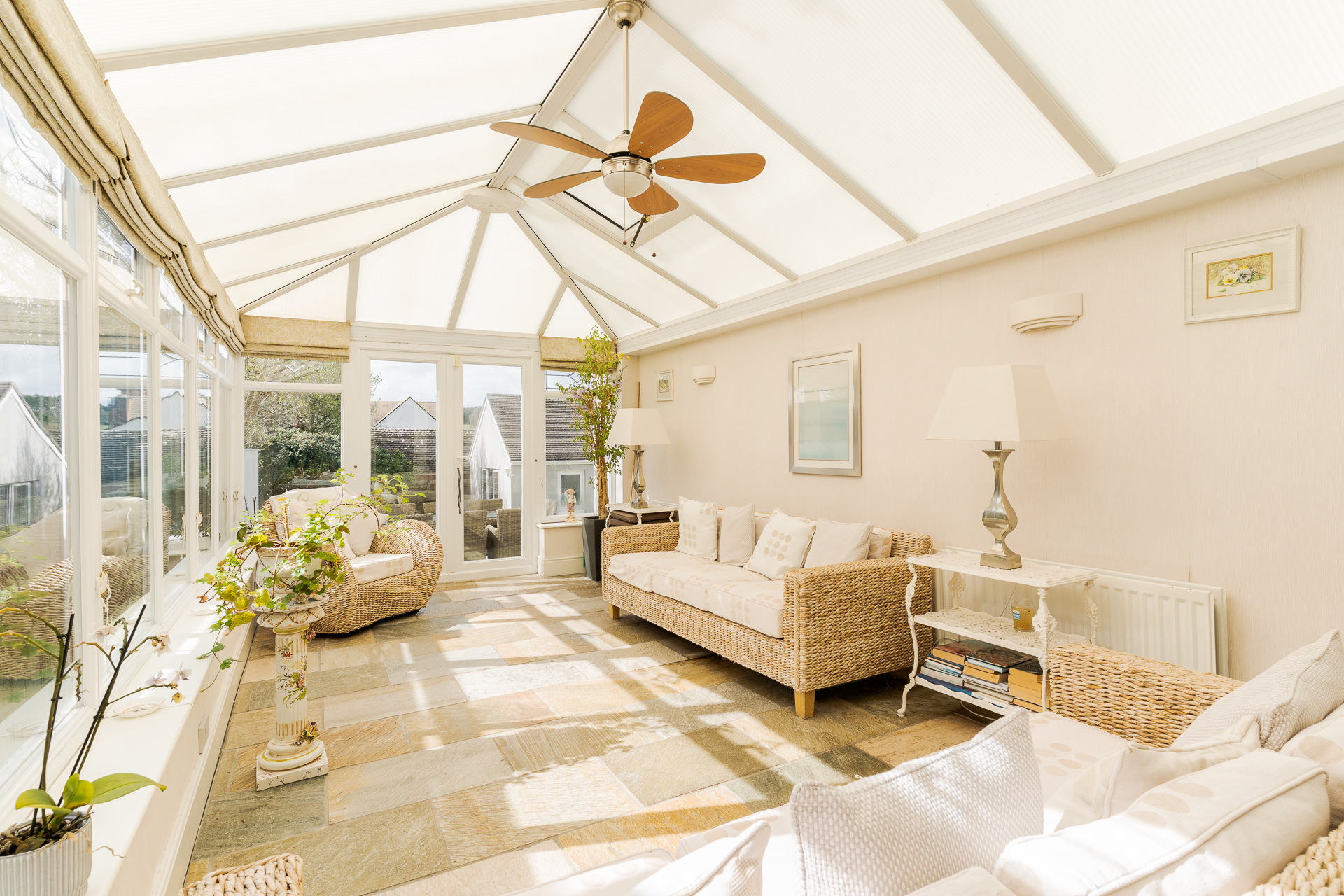 A very pleasant sitting room with uPVC double glazed windows and doors that give access into and overlook the garden. Natural stone flooring. Power points. Two central heating radiators. Electric light and ceiling fan. Fitted Roman blinds to all windows. Two fitted wall lights.