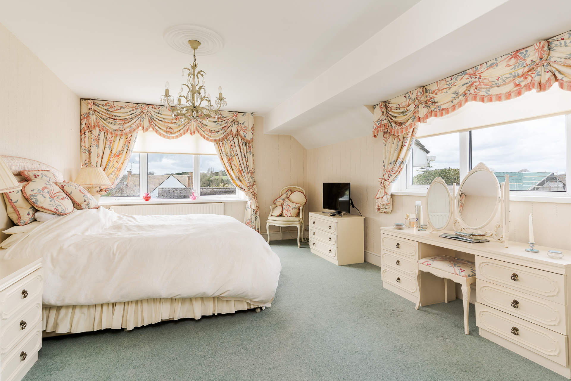 The master bedroom, with sea views and two en-suite bathrooms and a dressing room. Fitted carpet. uPVC double glazed window to the side with Channel views and a uPVC double glazed window to the rear that overlooks the garden. Two central heating radiators. Power points and TV point. Doors to both bathrooms and the dressing room.