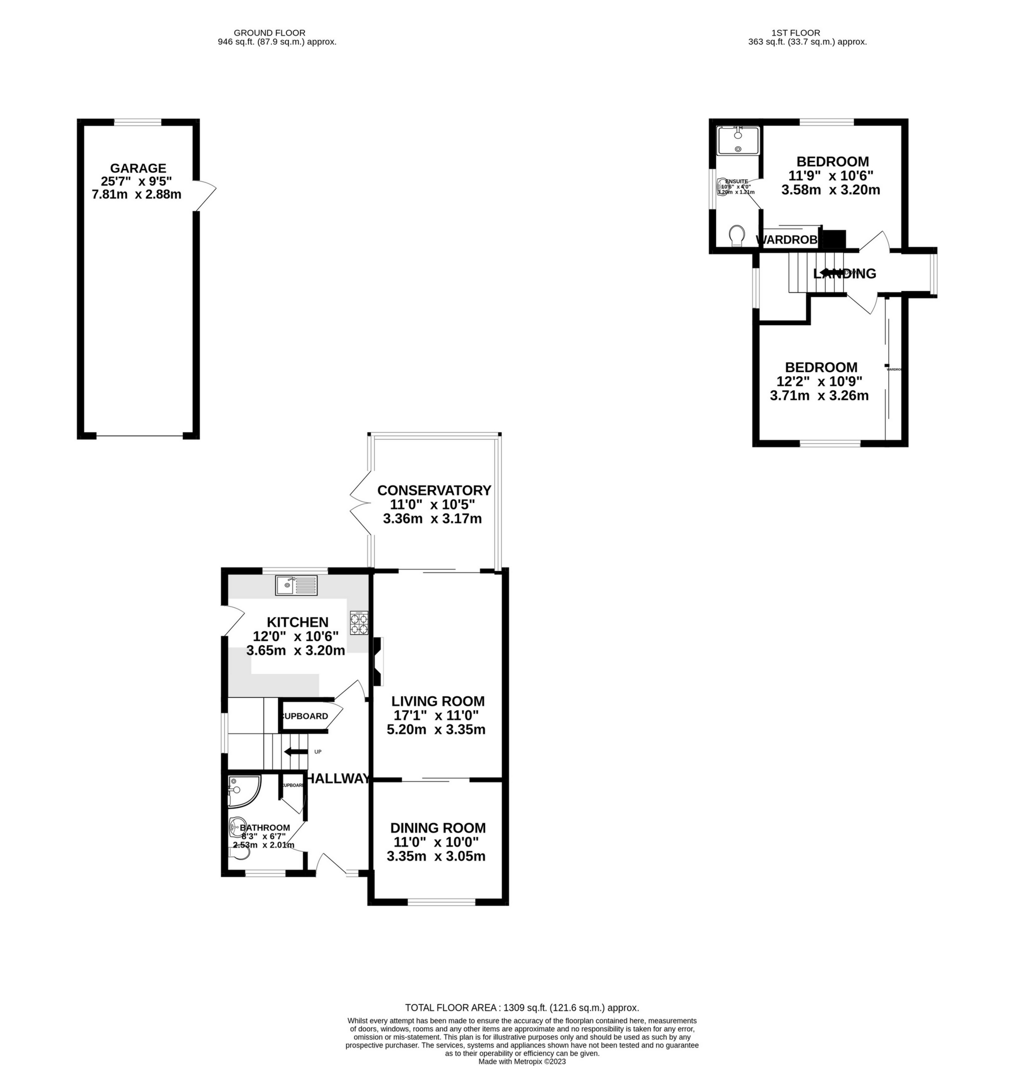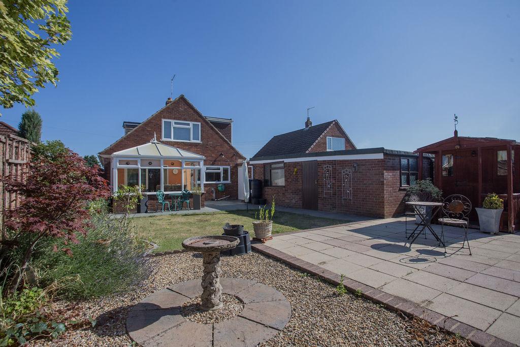 REAR GARDEN: Patio area with area laid to lawn and further patio area to rear of the garden. Shrub borders and area of gravel to one side. Brick wall boundaries. Outside tap. Personal door to garage. Garden shed.
