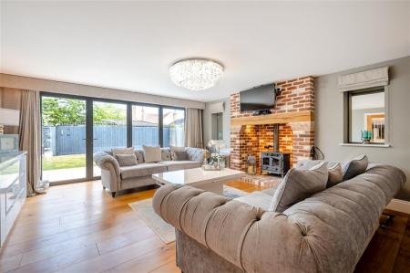 From the kitchen, further double doors lead to a sitting room, featuring a central fireplace with a log burner and gas supply to convert if required and elegant bifold doors that open directly onto the garden.
