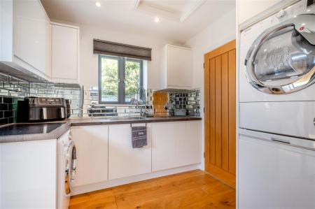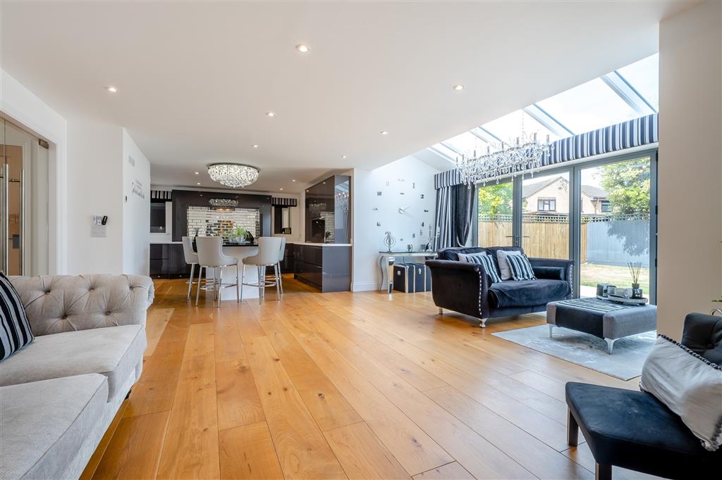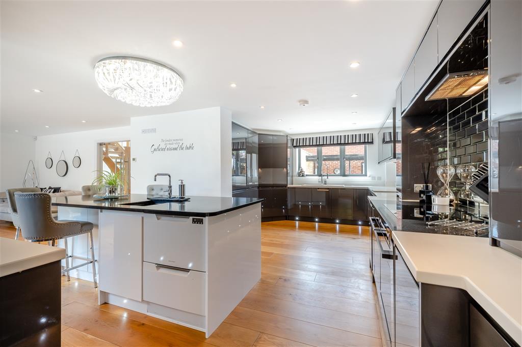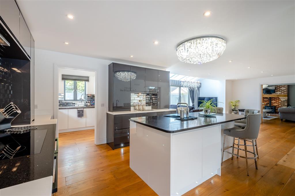 Double doors open into the heart of the home: a large, open-plan family kitchen and living space with bi-fold doors onto the garden. The contemporary kitchen is fitted with sleek base and wall units, centred around a generous island-perfect for entertaining. A separate utility room and an additional rear cloakroom provide added convenience.