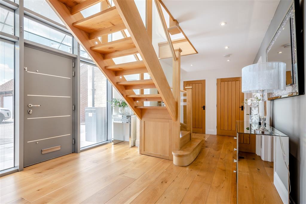 Upon entering, you're welcomed by a striking entrance hall, complete with a double-height picture window that floods the space with natural light. Off the hallway, there is a cloakroom, a well-appointed home office, and an additional study/dinning room.